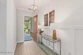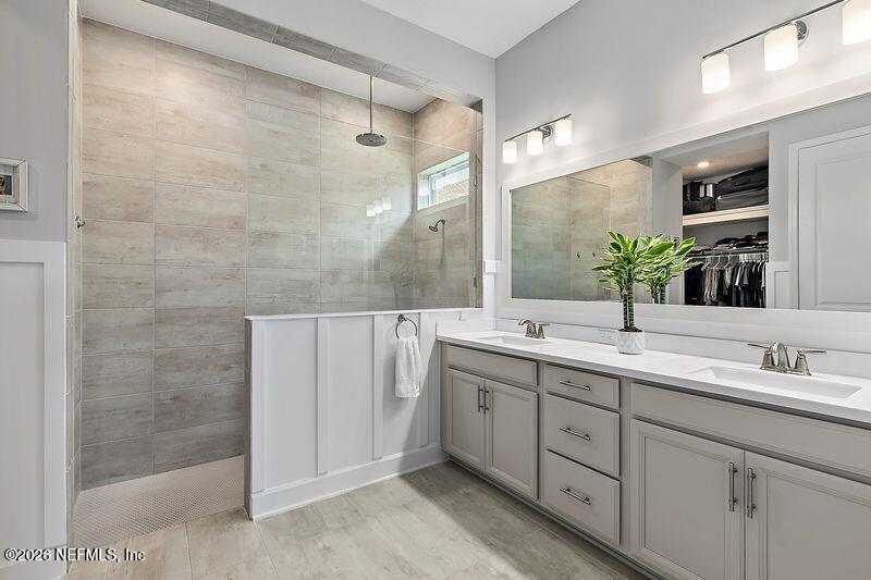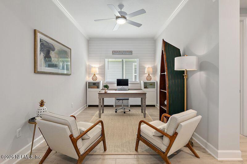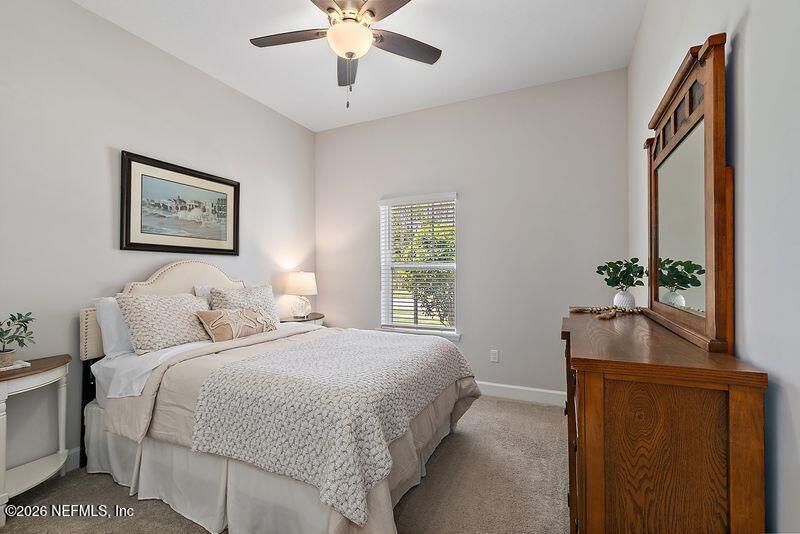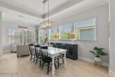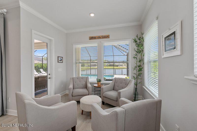 Elegant single-story pool home with peaceful lake and preserve views! This thoughtfully designed home features light wood-look tile flooring,custom trim details,and a bright open great room with tray ceiling and abundant natural light. The kitchen is a standout with white cabinetry,quartz countertops,picket tile backsplash,under-cabinet lighting,and a decorative island over 10 feet long--perfect for entertaining. Sliding doors lead to a covered lanai and stunning screened pool overlooking tranquil water and preserve views,creating a private outdoor retreat. The primary suite offers a tray ceiling and spa-style bathroom with a large super shower. A desirable split floor plan includes a private guest suite with its own bath,two additional bedrooms with a shared bath,a study with tray ceiling,and a powder room. Enjoy comfortable indoor-outdoor Florida living in a beautifully appointed home. Nocatee has so much to offer beautiful parks,restaurants and A rated schools. MLS# 2133891