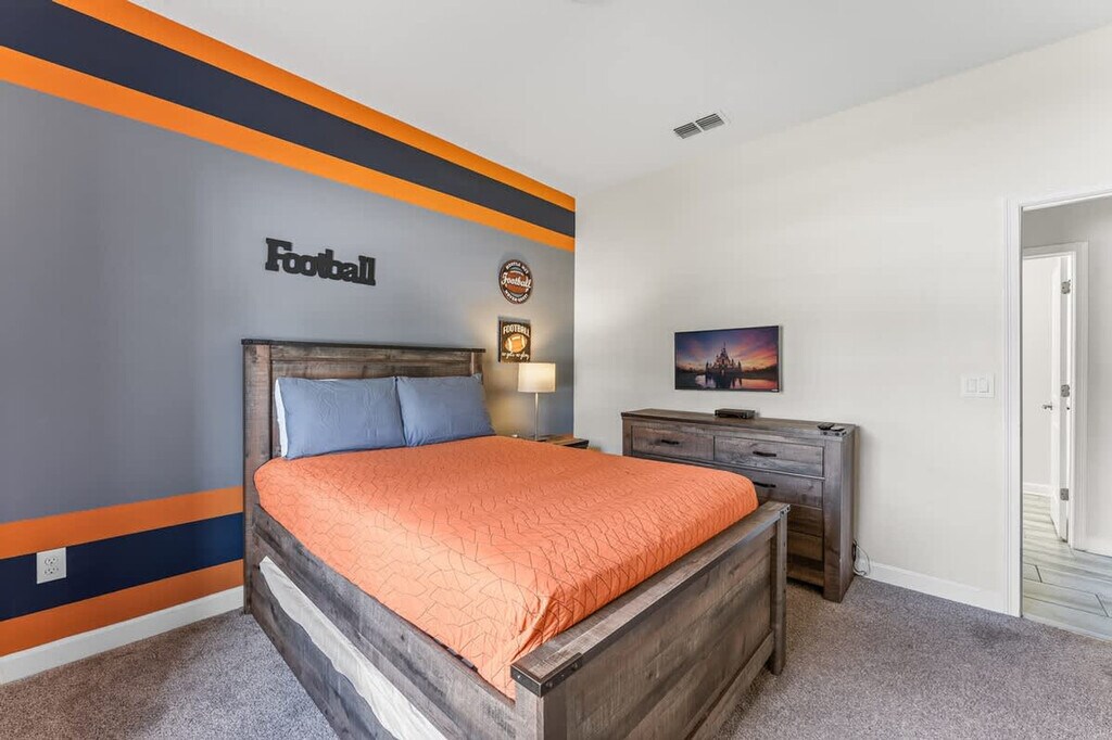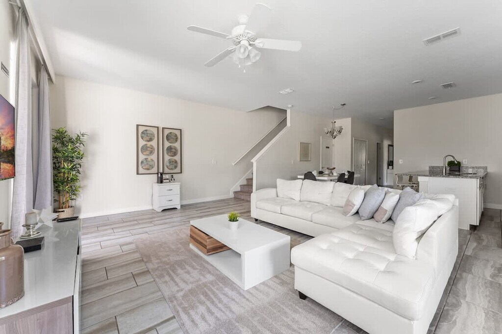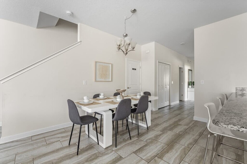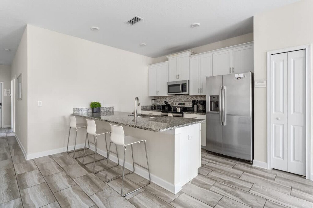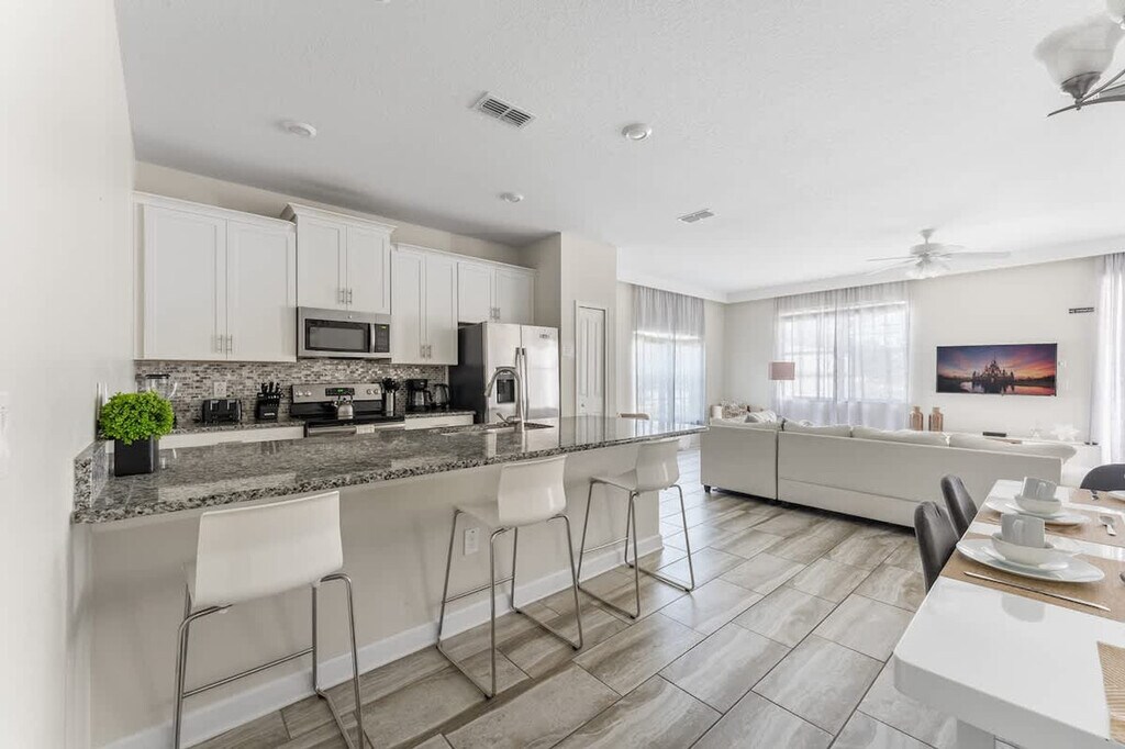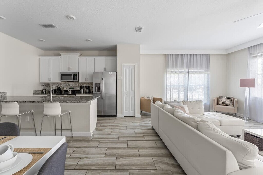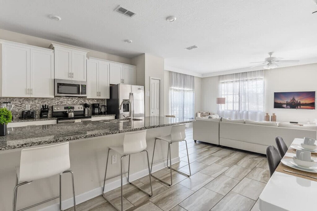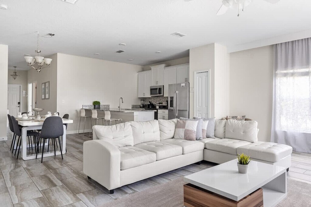 Feel at home in this spacious 5-bedroom, 4-bathroom property accommodating up to 12 guests. With a generous size of 2,168 sq/ft, this home offers a comfortable and inviting space for your stay. Enjoy the convenience of smart TVs in the living room and all bedrooms, ensuring entertainment is always at your fingertips. The property boasts a south-facing private pool and spa, complete with a safety fence for peace of mind. The pool heater is available for an additional fee, ensuring a warm swim even on cooler days. Baby items such as a Pack n' Play, stroller, baby booster feeding chair, and baby security gate are complimentary for all stays, making it a family-friendly choice. Optional extras and concierge services are available, including pool heater, grill rental, early check-in, late check-out, and mid-stay cleanings. Please check prices and availability. The pool heater can be added for $35 per day with a minimum of 3 consecutive days. Grills are not allowed on the property, but grill rental is available. Experience the luxurious vacation community of Storey Lake Resort, where magical adventures await just 4 miles away at Disney World. With Universal, Sea World, and other parks just minutes away, you'll have endless entertainment at your fingertips. Spectacular outlet shopping and fine dining options are also within a quick drive from the resort. At Storey Lake, you'll have access to top-notch amenities at "The Hideaway Club," including a fitness center, poolside dining and bar, resort heated pool and spa, lazy river, mini golf, water slides, splash pad, and kayak rentals. This property is not pet-friendly, but service animals and emotional support animals are welcome with a written request. Knowingly misrepresenting the use of a service animal is a second-degree misdemeanor. The property is 100% smoke-free, and any signs of smoking will incur a non-refundable fee of $250. Check-in is at 4 PM and check-out is at 10 AM. Early check-in and late check-out are available for an additional fee. The pool area is secured with a safety fence and padlocked screen doors for your safety. Wildlife and pests are common in Florida, and while regular pest control is provided, sightings may occur without refunds. For your safety, keep all windows and doors closed and locked at all times. Enjoy high-speed Wi-Fi with up to 1Gbs speed, perfect for remote work or streaming your favorite shows.