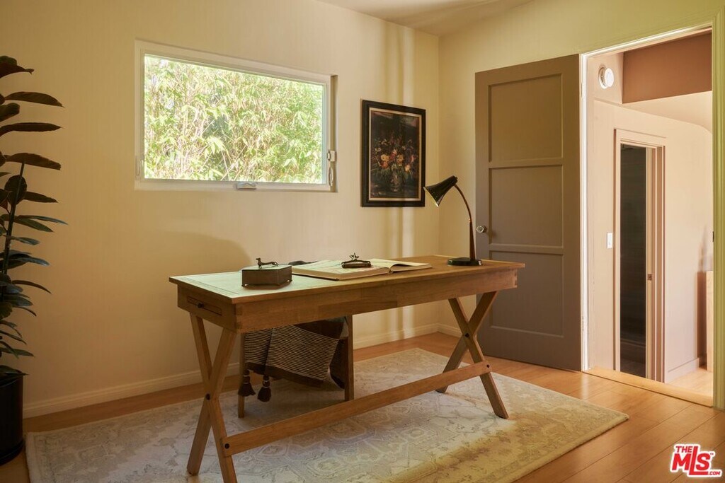 1940s traditional in University Hills with mountain and skyline views. Perched above the street, this 3-bedroom, 2-bath home has an impactful presence with its Streamline Moderne elements of strong horizontal lines and a curved overhang. Although the home is on a hillside, there's ample flat and usable areas to enjoy the Southern California sun. Approaching the home, you are greeted by a front yard with drought tolerant plants screening you from the street, native grasses and flowering mallow plants. The connection to the outdoors continues inside with a direct sight line to the backyard and numerous windows flooding the rooms with light and captivating skyline views. The kitchen has been thoughtfully redesigned and features new cabinetry, appliances and stainless steel countertops. The adjacent dining area is cozy with a wood banquette seating area. At the opposite end of the home are the bedrooms and two updated bathrooms with a warm neutral palette and timeless materials like marble and travertine. Flowing easily from the kitchen, is an oversized glass door that leads to a private back patio space. To the side of the house is a detached studio - perfect for a home office or creative pursuits. There's additional outdoor space for dining or lounging that overlooks the majestic San Gabriel mountains. When not enjoying your peaceful hillside home, you are only moments from local favorites like lil'East Coffee, Tirzahs Mexi-Terranean, Evil Cooks, Artemisia Nursery, Los Dorados LA, Correas Mariscos & Cocina, Holy Grounds Coffee + Tea or a short drive to other hip east side neighborhoods. If you are looking for a well designed hillside house with great outdoor space and views, this is your spot! MLS# 26644595