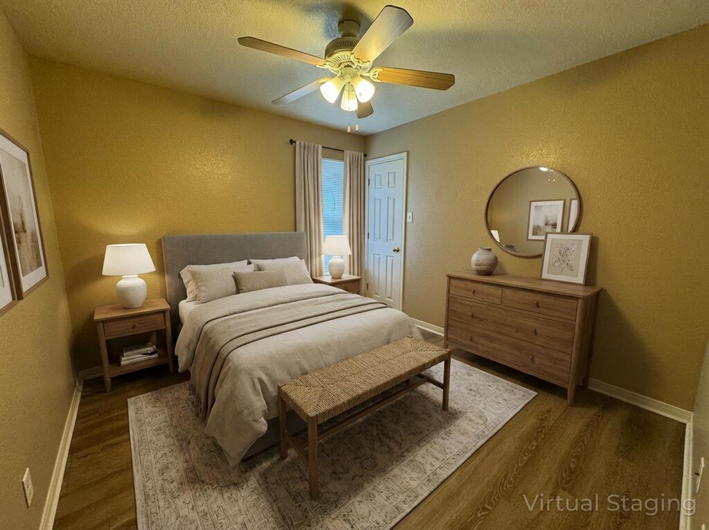 View 360 Virtual Tour: Welcome to this 3-bedroom, 2-bath duplex featuring stylish vinyl plank flooring throughout for easy maintenance and a modern look. The living area and all bedrooms include ceiling fans for year-round comfort. The kitchen offers traditional white appliances and opens to a dedicated dining space, perfect for everyday meals. Both bathrooms feature ample cabinet storage, providing plenty of room to stay organized. This home combines comfort, convenience, and functionality in a well-designed layout. Disclaimer: The furnishings or enhancements shown are AI-generated and intended for inspiration only. They may not reflect the actual scale, condition, or current features of the property.