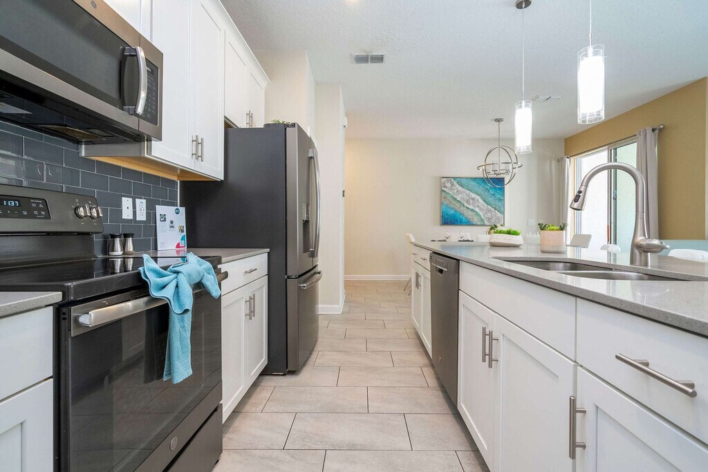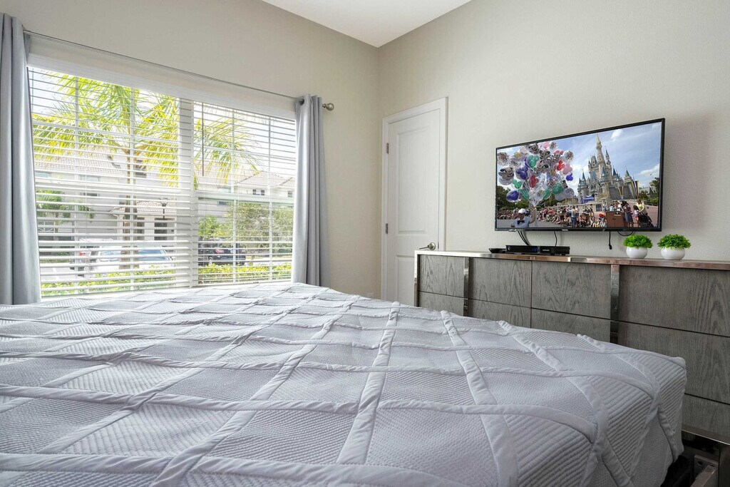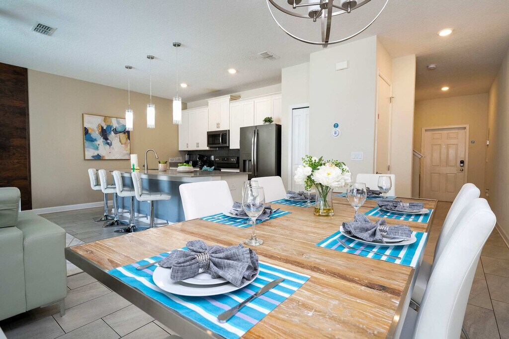 Discover the ultimate in comfort and space in this 4-bedroom townhome located in the highly sought-after Storey Lake Resort. Perfectly designed to accommodate up to 12 guests, this home offers the ideal setting for family or group getaways. The open-concept living, dining, and fully equipped kitchen areas create a spacious and inviting hub for relaxation and togetherness. Two themed bedrooms—Mickey and Minions—add a touch of whimsy and fun for guests of all ages, while the private pool on the patio provides a serene spot to unwind after a day of adventures. Welcome to your family’s perfect retreat! This thoughtfully designed 4-bedroom townhome at Storey Lake Resort offers an exceptional blend of comfort and convenience, making it ideal for your next vacation. The spacious living room seamlessly connects to the dining area and a fully equipped kitchen, creating a central hub for relaxation, meals, and family bonding. Step outside to your private patio, complete with a heatable pool—a perfect oasis to unwind after a day of fun. The first floor features a cozy queen bedroom with its own bathroom, offering privacy and convenience. Upstairs, you’ll find three more beautifully appointed bedrooms: a tranquil master suite with a king bed, a whimsical Mickey-themed room with a double and single bed, and a playful Minions-themed room featuring a bunk bed with two double beds and a trundle single bed. The Mickey and Minions rooms share a well-appointed bathroom, making them perfect for families or groups. A laundry room with a washer and dryer adds to your convenience, while complimentary Wi-Fi and free parking enhance your stay. A thoughtful welcome kit stocked with essential bathroom and kitchen amenities ensures a smooth start to your trip. Guests are responsible for replenishing amenities during their stay. Pool heating and barbecue grill use are available for an additional fee. Storey Lake Resort has the perfect location just 10 minutes from all major attractions and theme parks in Orlando, including Walt Disney World, Universal Resort, and Sea World. You will find fantastic resort amenities for the whole family to enjoy with a tiki bar, a resort-style pool with slides and lazy river, sports court, mini-golf, kayak, and fitness center. There are two clubs inside the property, one of them with a themed pirate pool that kids will love, just walking distance from the house. Located just off Osceola Parkway, the resort has easy access to restaurants, shopping, and supermarkets, all within a 5-minute drive. Quiet hours are between 22:00 and 8:00. [SI]