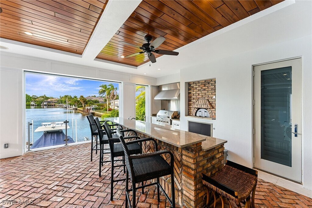 SINGLE FAMILY,WATERFRONT home with Old Florida charm and long water views available ANNUALLY or SEASONALLY. Just 4 blocks from the beach,these 4 bedroom + den home spans the 2nd and 3rd floors of this 3-story home with a private elevator (1st floor is enclosed parking). Brick and hardwood floors accented with shiplap walls and ceilings add to the charm of the main floor living space which includes a two-story great room with conversation seating for 8,a wet bar,a wine room/humidor (display only seasonally),half-bath and a grand player piano all overlooking the brick paved vanishing edge pool with fire feature. Also located on the main floor are the primary suite with a king bed,open balcony and en-suite bath as well as the den with a desk,twin sleeper sofa,laundry room and ½ bath. On the other side of the main living area you'll find formal dining space,a family room with a large,mounted TV over the fireplace,and an exquisite kitchen with two islands,two refrigerators and counter seating for 4. The family room expands by opening the sliding glass doors to the covered patio area with additional seating around its own fireplace/TV area as well as an outdoor kitchen with a gas grill and pizza oven. This covered area can be closed with remote controlled screens. The top floor of the home has another King Suite with a private balcony,full bath,and walk-in closet; a Queen Suite with its own bath/closet and shared open balcony; and a full Guest Suite with a King bedroom,full bath,full kitchen with counter seating,living room with full-size sleeper sofa,and a shared large balcony offering both a covered area as well as an expansive sun deck. There is also a loft with a game table and comfortable seating for reading and enjoying views down the widest canal in Aqualane Shores. Backyard fun includes a putting green with Adirondak chair seating,a boat slip with a 34K lb. lift,and a fish cleaning station. ALSO AVAILABLE ANNUALLY.