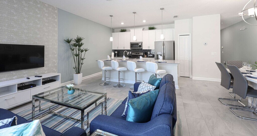 Experience ultimate comfort and relaxation in this 4-bedroom townhome located in the vibrant Storey Lake Resort. Perfect for families, the resort features a variety of amenities, including a pool, fitness center, tiki bar, and mini-golf, offering something for everyone. Designed to host up to 10 guests, the home boasts an open-concept living, dining, and kitchen area, ideal for shared moments. Enjoy your own private pool, perfect for unwinding after a day of adventure. Welcome to your family's ideal getaway! This thoughtfully designed 4-bedroom townhome offers the perfect combination of comfort and convenience. The open-concept living room seamlessly connects to the dining area and fully equipped kitchen, creating a welcoming space for relaxation and shared meals. Step outside to your private patio, where a heatable pool awaits, offering a serene spot to unwind after a day of adventure. The first floor features a cozy queen bedroom with its own bathroom, providing privacy and convenience. Upstairs, you’ll find three additional bedrooms: the comfortable master suite with a king bed, a Mickey-themed room with a bunk bed (a double and two single beds), and a queen bedroom. The Mickey-themed and queen rooms share a bathroom, making this set-up perfect for families or groups. For added convenience, the home includes a laundry room with a washer and dryer, complimentary Wi-Fi, and free parking. A welcome kit with essential bathroom and kitchen amenities ensures a smooth start to your stay. Your family’s dream vacation home is ready to host unforgettable memories. Pool heating is available for an additional fee and the use of the barbecue grill also incurs a charge. Storey Lake Resort has the perfect location just 10 minutes from all major attractions and theme parks in Orlando, including Walt Disney World, Universal Resort, and Sea World. You will find fantastic resort amenities for the whole family to enjoy with a tiki bar, a resort-style pool with slides and lazy river, sports court, mini-golf, kayak, and fitness center. There are two clubs inside the property, one of them with a themed pirate pool that kids will love, just walking distance from the house. Located just off Osceola Parkway, the resort has easy access to restaurants, shopping, and supermarkets, all within a 5-minute drive. Guests are responsible for replenishing amenities during their visit. Quiet hours are between 22:00 and 8:00. [SI]
