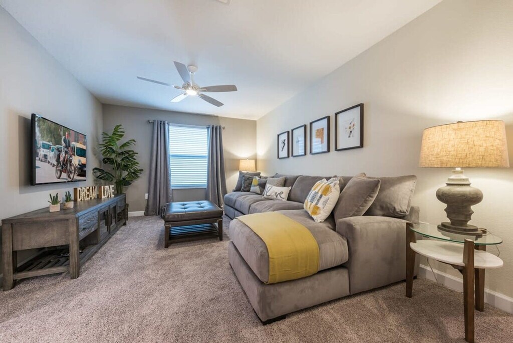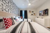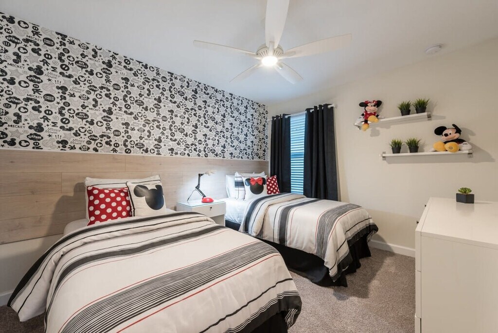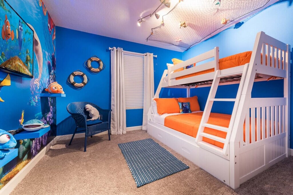 Indulge in an exquisite retreat at this opulent 6-bedroom, 5-bathroom home in Storey Lake Resort, just a 10-minute drive from Disney parks. Revel in the lavishness of a private pool and expansive living area, while relishing easy access to nearby dining and shopping. Embrace quality time with loved ones in this stunning home, a true home-away-from-home that promises an unforgettable vacation. Step into this alluring 6-bedroom haven, an exquisite blend of opulence and design. With space for up to 13 guests, this sanctuary ensures a delightful stay. Upon entry, an expansive living room flows harmoniously into the dining area and a fully equipped kitchen, fostering a hub of culinary and relaxation delights. Yet, the true allure lies within the luxury adornments and themed bedrooms – immerse in the enchantment of Mickey and Nemo realms, igniting imaginations of all. Outdoors, a private heatable pool beckons for relaxation and enjoyment of splendid views. The first floor unveils a king bedroom with a bathroom, a haven of convenience and seclusion. Ascend to the second floor, where a super comfortable family room adds entertainment value. The master king bed suite exudes luxury, while an additional king bedroom and the Mickey-themed room with two single beds extend equal invitation. The Nemo bedroom, featuring a bunk bed with a double and a single, alongside a third bedroom with two single beds, assure utmost comfort. Further enhancing your experience, a game room adds a dash of fun, while a laundry room with washer and dryer, free Wi-Fi, complimentary parking, and a welcome kit with essentials anticipate your needs. Heating the pool is a paid service and there is also a fee charged to use the barbecue grill. Storey Lake Resort has the perfect location just 10 minutes from all major attractions and theme parks in Orlando, including Walt Disney World, Universal Resort, and Sea World. You will find fantastic resort amenities for the whole family to enjoy with a tiki bar, a resort-style pool with slides and lazy river, sports court, mini-golf, kayak, and fitness center. There are two clubs inside the property, one of them with a themed pirate pool that kids will love, just walking distance from the house. Located just off Osceola Parkway, the resort has easy access to restaurants, shopping, and supermarkets, all within a 5-minute drive. Quiet hours are between 22:00 and 8:00. Replenishment of bathroom and kitchen amenities is the guest's responsibility. [SI]