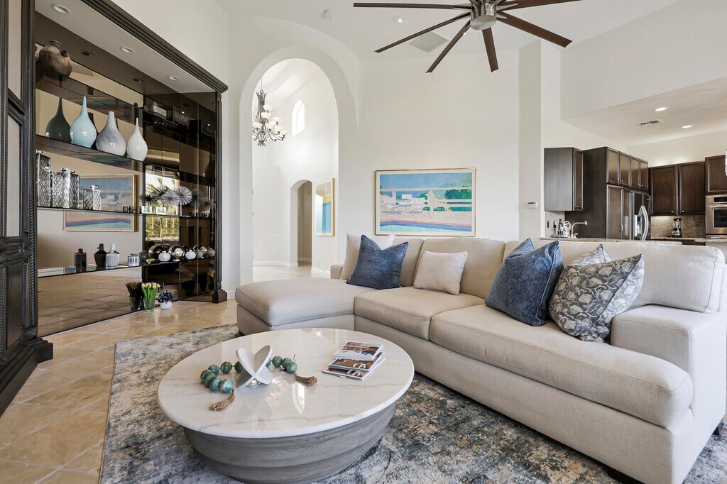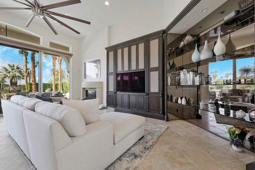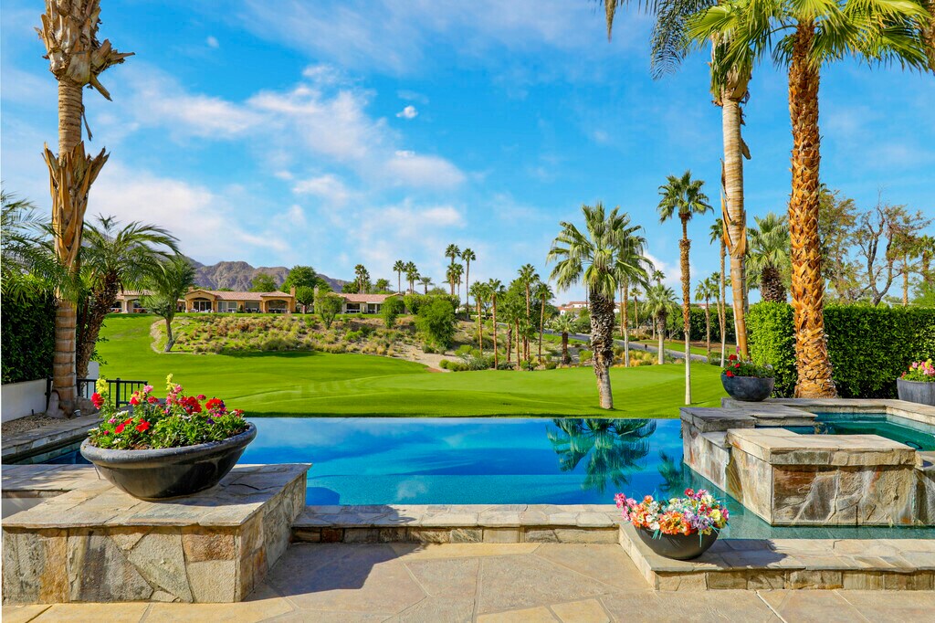 Experience the ultimate desert getaway in a beautifully appointed home that offers both comfort and spectacular scenery. Take in breathtaking panoramic views of the Santa Rosa Mountains and lush golf course from nearly every room. Relax by the stunning custom infinity pool,raised spa,and cascading waterfalls while soaking in the serene desert landscape. Designed for seamless indoor-outdoor living,the spacious step-down BBQ area is perfect for entertaining as guests swim and unwind. The poolside setting offers a tranquil space to relax,dine,or enjoy spectacular sunsets. Inside,tasteful and comfortable finishes create a welcoming retreat ideal for seasonal stays,with an open-concept layout that maximizes natural light and views. Three bedrooms plus an office provide ample space for family and friends. Guests can also enjoy access to Rancho La Quinta Clubs Olympic-sized pool,world class tennis courts,pickleball courts,and limited golf privileges up to six times per calendar year. Come to the Desert and make this your perfect vacation home.