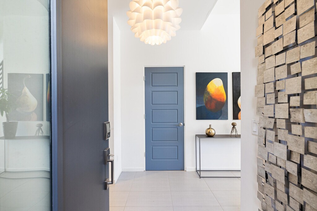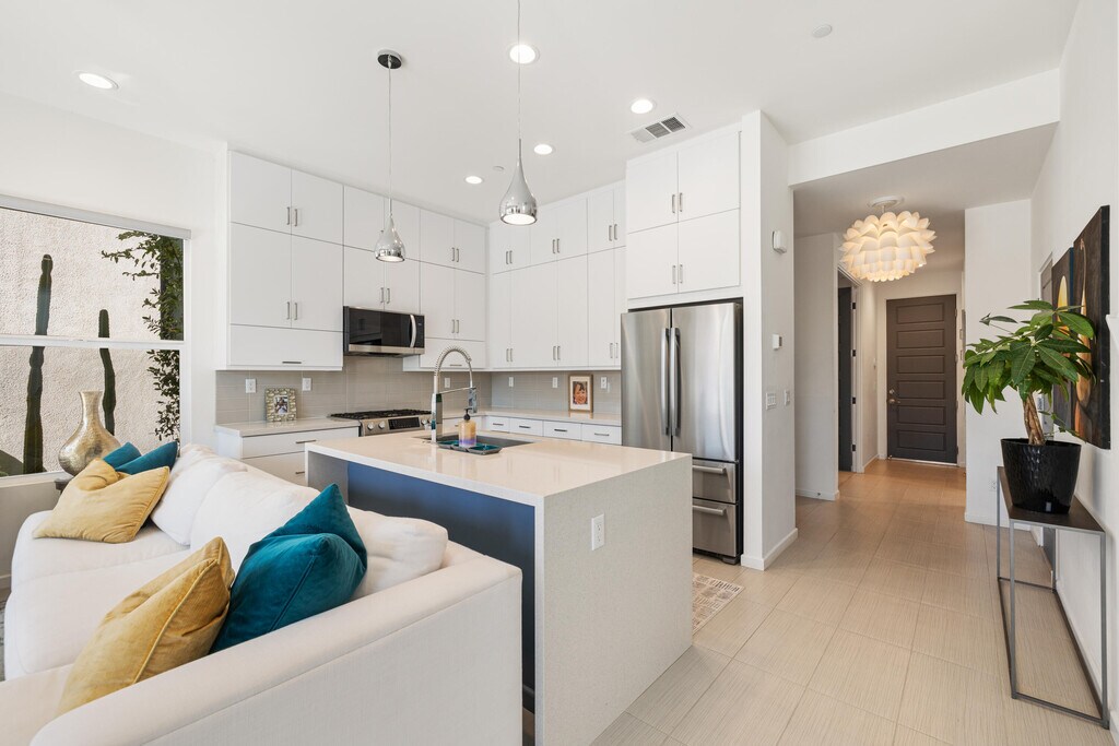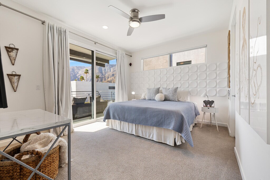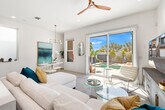 Striking modern architecture meets effortless desert living in this detached residence at ICON,a private gated community minutes from the excitement of downtown Palm Springs. Offering 2 bedrooms + den/office,2.5 baths,and 1,558 sq. ft.,this home features soaring 12' ceilings,quartz countertops,a sleek modern kitchen,and abundant natural light. Enjoy two en-suite bedrooms with private balconies,a Tesla solar system,water softener,motorized awnings,and energy-efficient construction. Outside,relax in your private saltwater pool & spa with mountain views,outdoor shower,firepit,and lush landscaping. Available for a one-year lease,can be offered furnished or unfurnished.