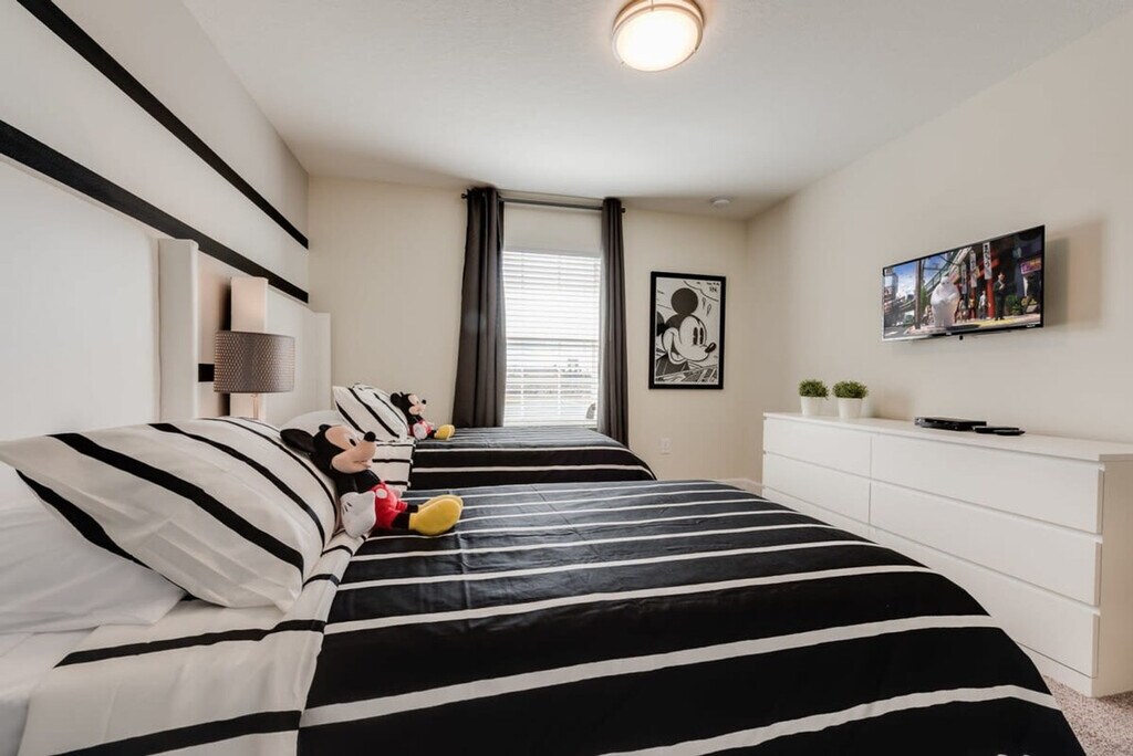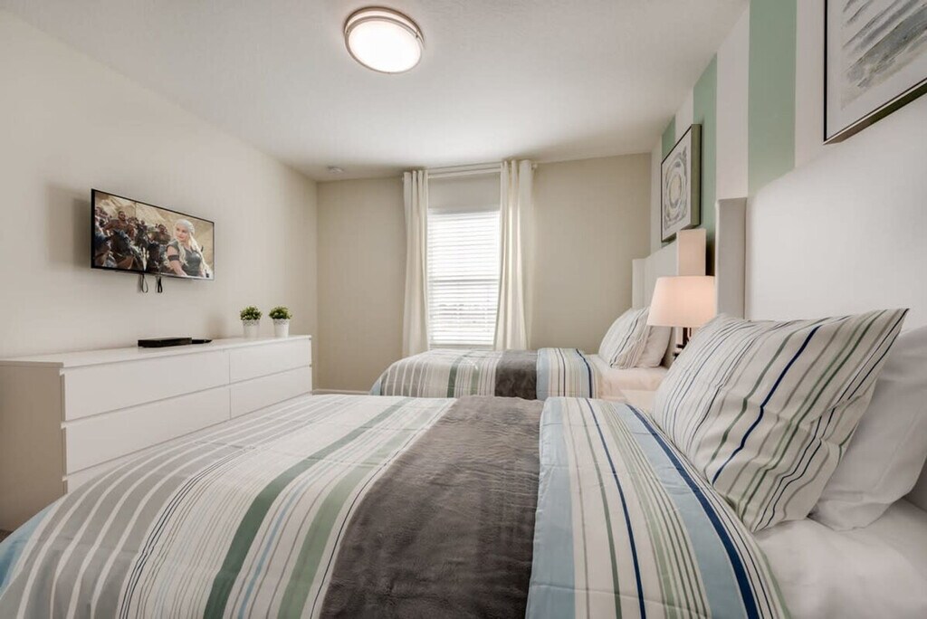 Discover comfort in this spacious 4-bedroom home where the living room seamlessly connects with the dining area and kitchen, creating a haven for relaxation. Accommodating up to 8 guests, this retreat features a private pool. Nestled in Storey Lake, just a 10-minute drive from Disney parks, your dream vacation begins here. Discover the epitome of vacation comfort in this spacious 4-bedroom home. Seamlessly integrated, the living room, dining area, and fully equipped kitchen create a haven for relaxation. Every detail has been meticulously designed to ensure an exceptional stay. Step onto the patio, where a private heatable pool invites relaxation. The first floor features a queen bedroom with an attached bathroom for convenience. Upstairs, the lavish master king bed suite promises restful nights. Two additional bedrooms share a bathroom, each with two single beds. For your convenience, a dedicated laundry room with washer and dryer is available. Stay connected with free Wi-Fi and enjoy complimentary parking. Your journey begins with a thoughtful welcome kit, brimming with essential amenities. Replenishment of bathroom and kitchen amenities is the guest's responsibility. Heating the pool is a paid service and there is also a fee charged to use the barbecue grill. Storey Lake Resort has the perfect location just 10 minutes from all major attractions and theme parks in Orlando, including Walt Disney World, Universal Resort, and Sea World. You will find fantastic resort amenities for the whole family to enjoy with a tiki bar, a resort-style pool with slides and lazy river, sports court, mini-golf, kayak, and fitness center. There are 2 clubs inside the property, one of them with a themed pirate pool that kids will love, just walking distance from the house. Located just off Osceola Parkway, the resort has easy access to restaurants, shopping, and supermarkets, everything within just a 5-minute drive. Quiet hours are between 22:00 and 8:00. [SI]