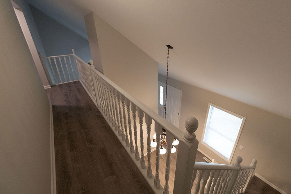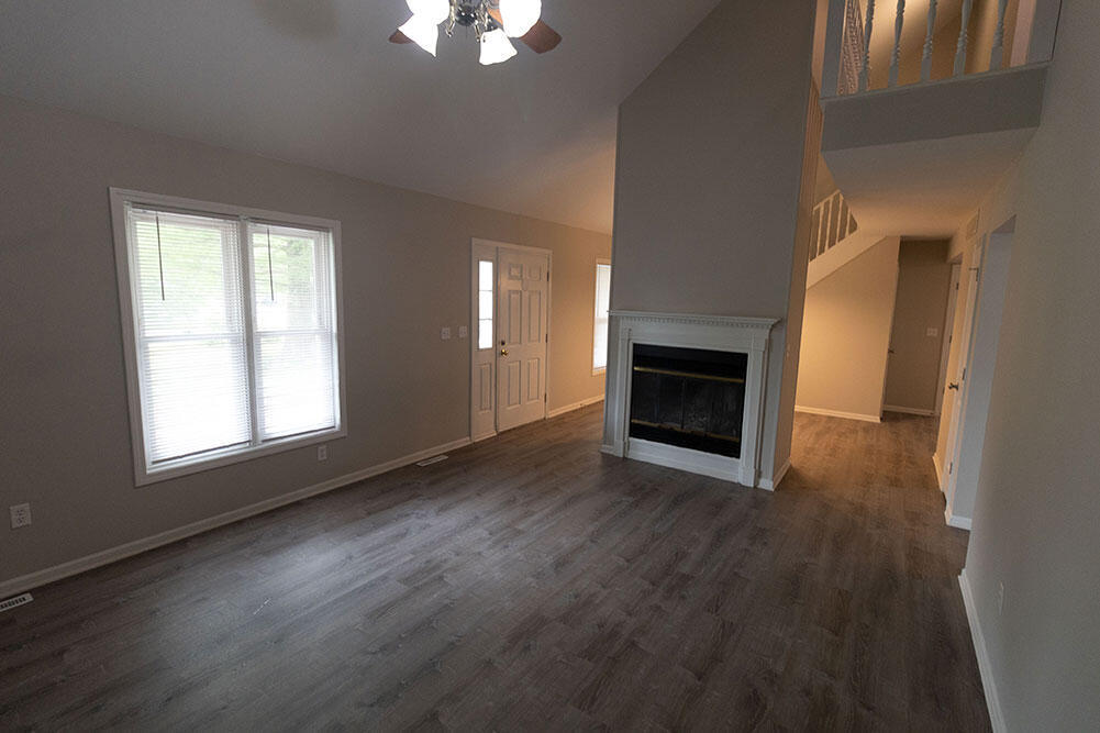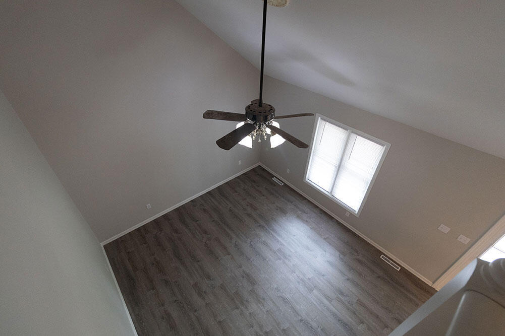 Lovely story-and-a-half home situated on a large lot,featuring a covered front porch,attached two-car garage,and fenced backyard. Inside,enjoy vaulted ceilings,a fireplace in the living room,and a spacious,fully equipped kitchen with a separate dining area. The main-level primary bedroom is complemented by two additional bedrooms and a full bathroom upstairs. Beautifully updated with luxury vinyl flooring,ceiling fans throughout,and a unique,open layout.