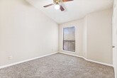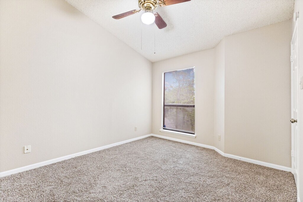 Recently renovated and ready for move in, this charming condo offers an open floor plan with high ceilings and new flooring throughout, creating a bright and comfortable living space. The living room features a brick fireplace, perfect for cozy evenings, while the kitchen offers plenty of cabinet space and includes all appliances, including the refrigerator. The laundry room is conveniently located just off the kitchen. A versatile office space with abundant windows, built-in cabinets, and shelving can also serve as a secondary bedroom, making it ideal for working from home or accommodating guests. The primary suite features high ceilings, a ceiling fan, a spacious closet, and a tub/shower combo with a single vanity. Enjoy relaxing evenings outside on the private balcony. Conveniently located near major highways, USAA, UTSA, Fiesta Texas, La Cantera, The Rim, and plenty of shopping and dining options.
