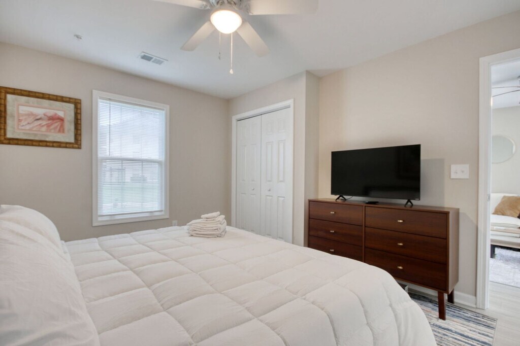 Feel at home in this cozy 2-bedroom golf villa located at River Oaks 30 C in Myrtle Beach. This spacious condo rental offers beautiful fairway views and is the perfect destination to enjoy all that the Grand Strand has to offer. The spacious living room welcomes you into this beautiful vacation rental, leading to the dining and kitchen area. The fully equipped kitchen is perfect for cooking breakfast to savor at the four-seater dining room table. A washer and dryer are available for your convenience. The master bedroom features a king-size bed and an en-suite bathroom with a large vanity space and a private bath/shower area. The second bedroom contains two full-size beds, and the second bathroom has a bath/shower combo. There is ample space for up to six guests in this condo. River Oaks Resort offers fantastic on-site amenities like tennis courts, grilling areas, and indoor and outdoor pools. River Oaks Resort is surrounded by premier golf courses and is a short drive away from Tanger Outlets, Myrtle Beach Speedway, and Coastal Grand Mall. The Atlantic Ocean and its sandy beaches are less than 15 minutes away. The unit is designated as non-smoking. No parties are allowed. [SI]