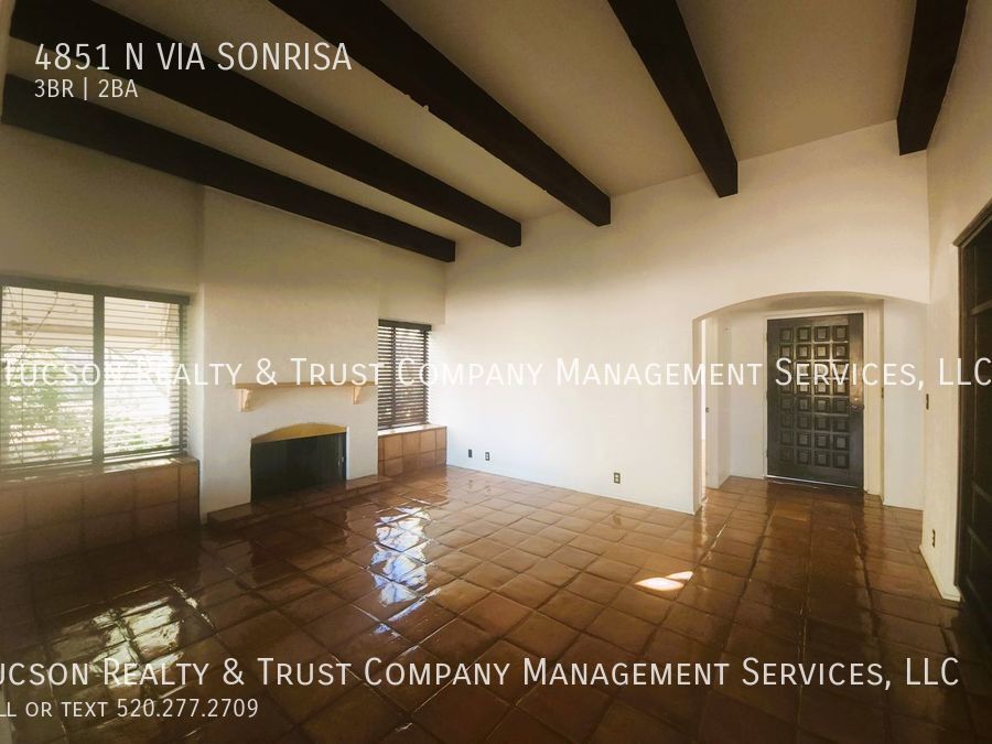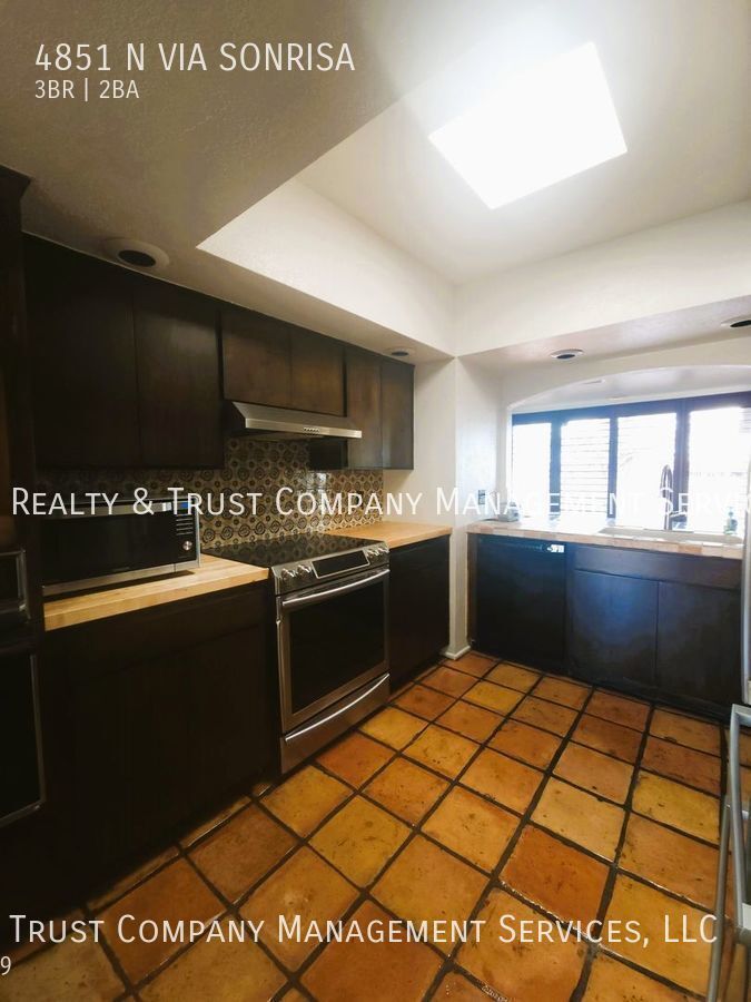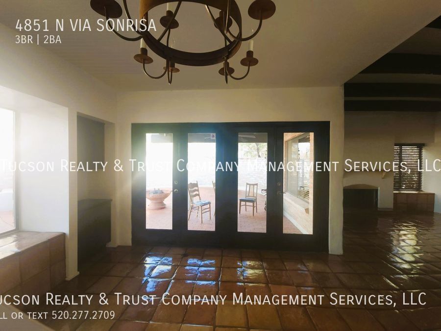 Beautiful southwest style refurbished 3 bedroom 2 bath, polished Saltillo tile home In a peaceful foothills neighborhood, The home has high beam ceilings, skylights throughout, a fireplace, impeccable views of the Catalina mountains from the cozy backyard. along with a city light view from a secluded quiet walled patio in the front. French doors from the master bedroom and the dining room, along with picture windows allow for a magnificent mountain view and enter into the back patio/yard which features a ceiling fan and firepit. Other features include: Great built-in shelves, cabinet space and closets, 2-car red-brick carport with storage area, central A/C and all the appliances including washer and dryer, walled in backyard area. Located very close to the parking entrance of the River Walk, A recreation area with pool, ramada and facilities are maintained and included. The pool area boasts privacy along with magnificent views of the city lights. Water, Landscaping and HOA fees are included with the rent.