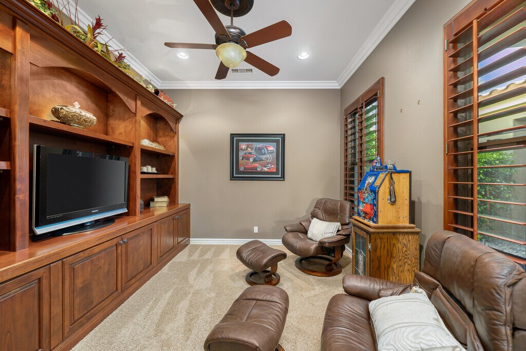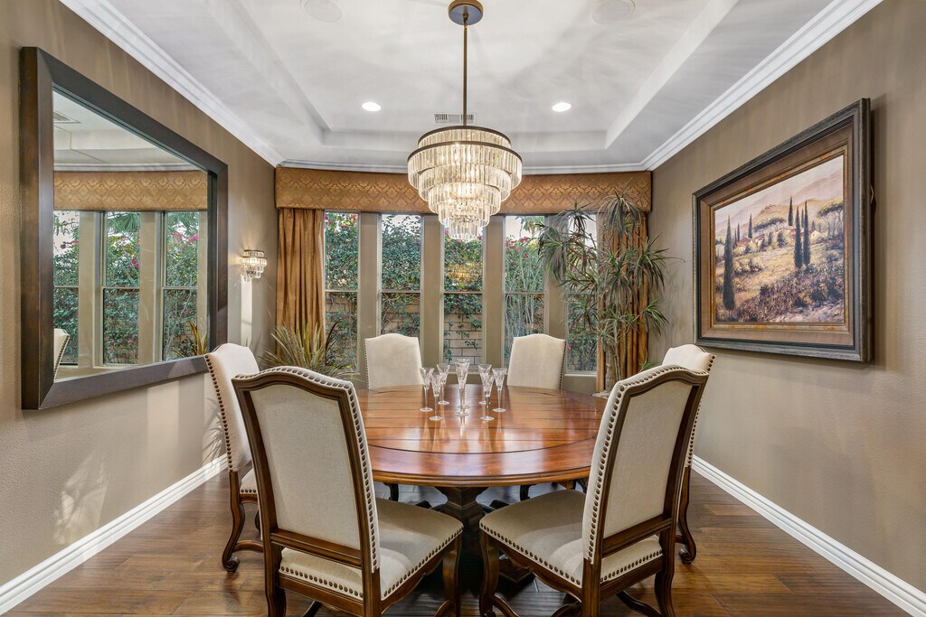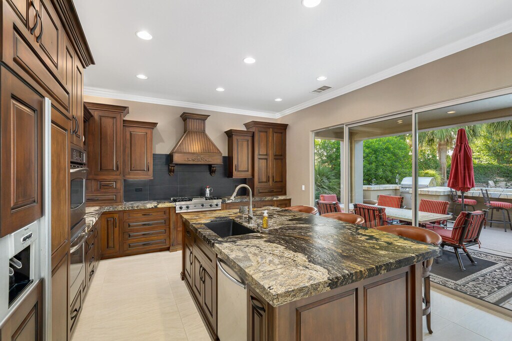 Available for a year lease! Casa Marbella showcases a resort-like backyard oasis with lush greenery,palm trees,and an expansive custom pool and spa with a spectacular waterfall. The private courtyard entry with a flowing water feature leads inside to a wall of glass that was professionally engineered to bring in the light & stunning views across the back of the entire great room & kitchen! Outdoor living is where Casa Marbella truly shines. Take a leisurely dip in the pool for a moment of serenity and rinse off in the outdoor shower. Lounge and relax under the covered portico with cocktails or fresh lemonade and watch golf on the outdoor television. Entertain guests at the impressive six-stool fire bar with the fully equipped outdoor kitchen,mini-fridge,and BBQ station. Enjoy s'mores or a glass of wine around the wood-burning fire pitDine overlooking the gorgeous backyard landscape with the mountains and sunset offering breathtaking views. Once inside,you can host dinner for family or friends in the stylish formal dining room with a modern crystal chandelier and seating for 6. Head to the comfy leather couch in the living room and wind down by the gas fireplace,or perhaps watch a movie or game in the media room just adjacent. When it's time to sleep,let guests choose between the three lavish queen bedrooms or head straight to the Master Suite. Indulge in a self-care bath soak in the luxurious tub listening to the music of your choice before snuggling into the king bed under the fine linens. Wake up feeling refreshed,get some work done in the office,or manage your tasks and feel ready for the day. Whether you want to decompress or entertain family and friends,Casa Marbella is the ideal desert oasis.