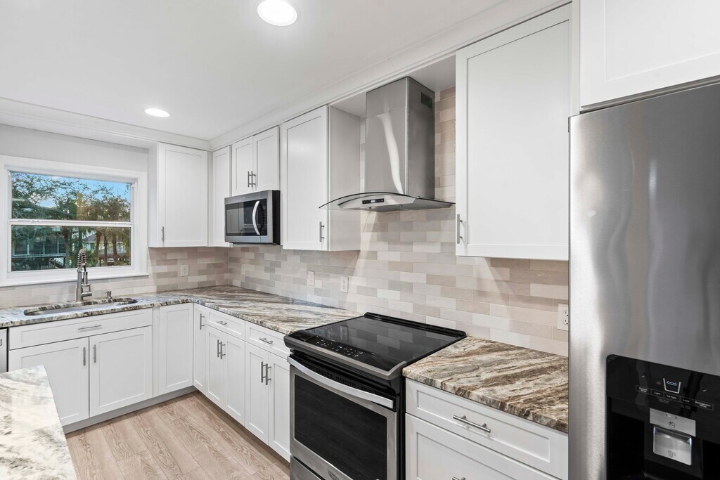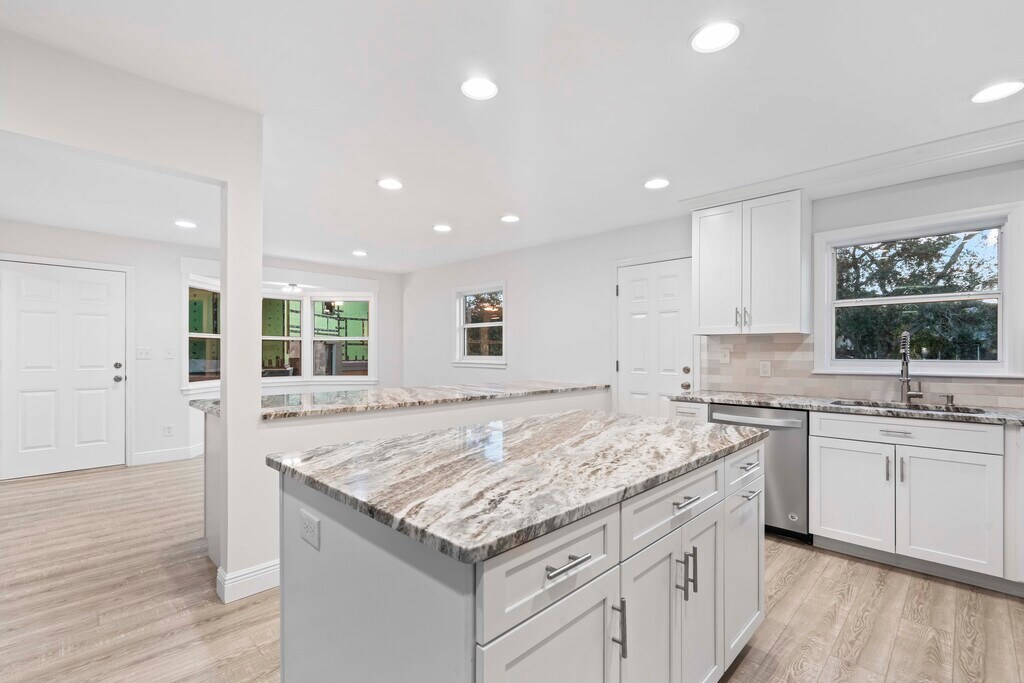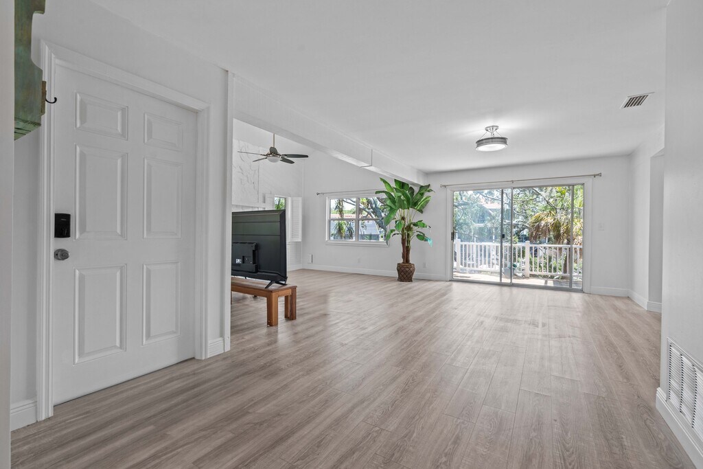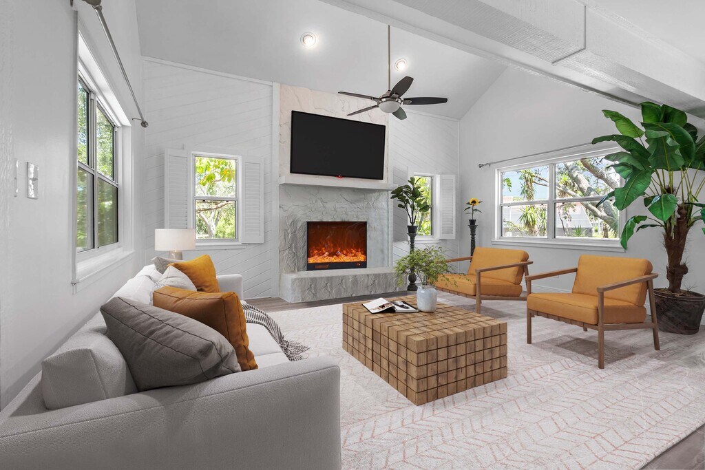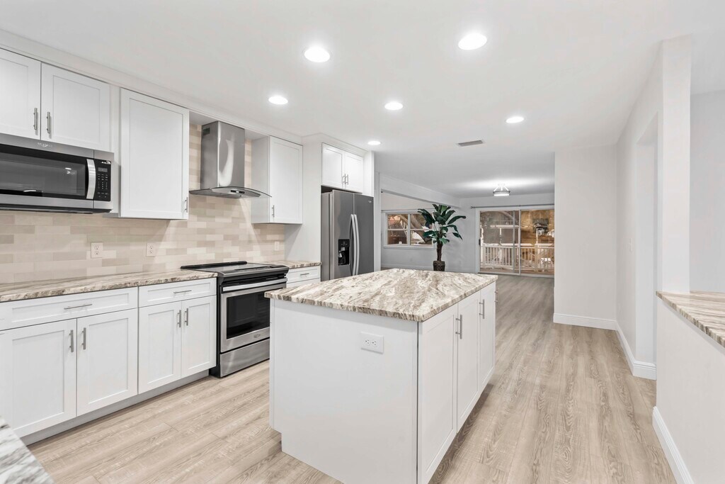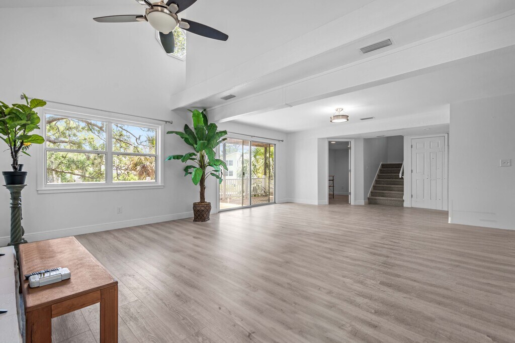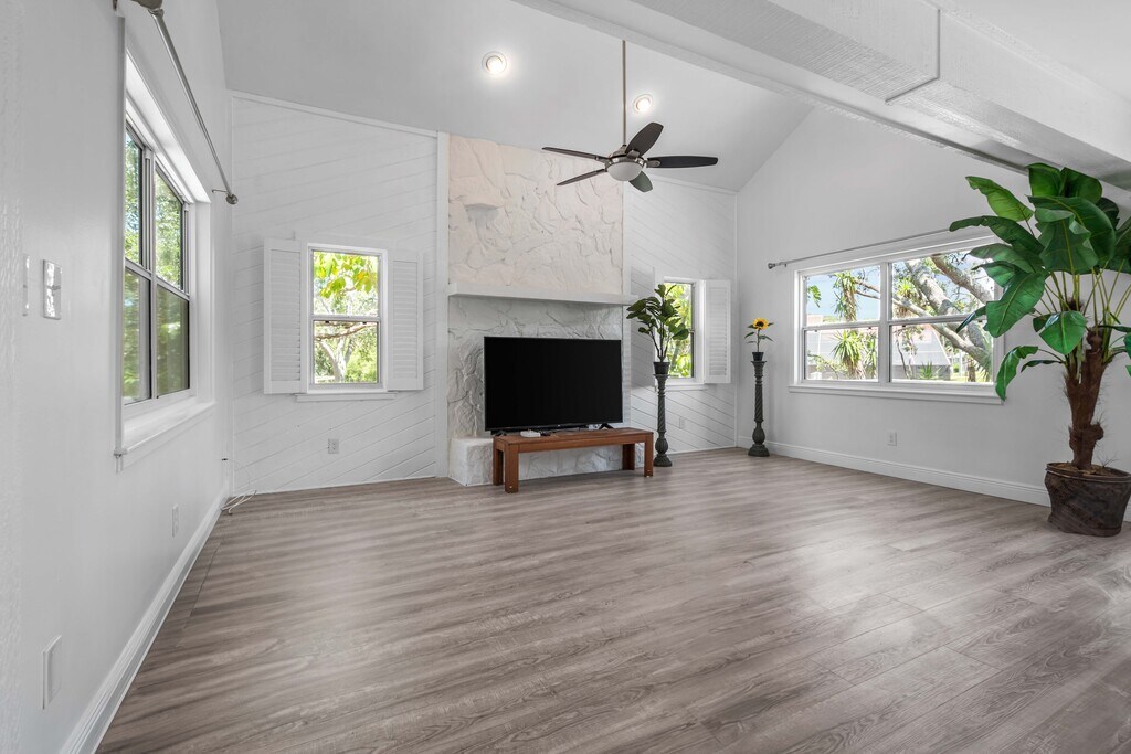 Enjoy living in a boating community right on the water in a beautiful, recently renovated 3-bedroom/2.5-bathroom/1-office home in Palm Harbor. The home is on 3 levels. The ground level is unfinished and can be used for many different activities and is enormous and includes garage parking for 4 cars. Enter onto the second level, which is securely above the flood zone, and you will be greeted by large spacious rooms and soaring ceilings. The large living room has a working fireplace and leads into the dining area and massive kitchen with unusually beautiful granite countertops. There is also a small office, a half bathroom and a laundry area on this floor. There is also a massive balcony/deck off the living area with views over the large backyard and canal. Go upstairs again to find three beautiful bedrooms with fabulous views over trees and the canal, plus more soaring ceilings in some rooms! The master suite has a great bathroom and private deck overlooking the canal. The furniture at the home can stay or be taken away. Some of the furniture is virtual staging. Pets are considered and deposit would depend on the pet. The canal leads out to the Gulf of Mexico, with a bridge you’ll encounter along the way.