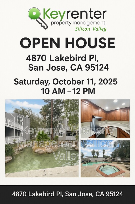 Welcome to your new home in the heart of San Jose, CA. This one-bedroom, one-bathroom residence is a perfect blend of comfort and convenience, offering a host of modern amenities. The home features high/vaulted ceilings, hardwood flooring, and recessed lighting, creating a spacious and inviting atmosphere. The kitchen is equipped with new, energy-efficient stainless steel appliances, including a French door refrigerator. Step out onto your private balcony for a breath of fresh air, or unwind in the hot tub after a long day. The property also boasts a swimming pool for your enjoyment. This no-smoking home is located within a beautifully landscaped condominium complex, offering immediate freeway access to Highway 85. Just a 5-minute drive away, you'll find the scenic Belgatos Park, perfect for hiking and outdoor activities. For your daily needs, an open-till-11pm Safeway is just a 5-minute walk away. The nearby Camden Park Plaza is home to a variety of wonderful restaurants. Plus, Downtown Los Gatos and Vasona Park are easily accessible for a quick drive. With a lake/pond on the premises, this home truly offers a unique living experience in San Jose. >>>> Join us for an open house at 4870 Lakebird Pl, San Jose, CA 95124 on Saturday, October 11th from 10 AM to 12 PM—explore this tranquil, beautifully landscaped property and discover your next home! <<<< *IMPORTANT THINGS YOU SHOULD KNOW: • No smoking •$55 Application Fee per applicant 18 or older. • Application processing time is 2-3 business days. Please review Keyrenter's Application Criteria prior to applying. (COMPLETING THE INCOME VERIFICATION PROCESS IN THE APPLICATION WILL EXPEDITE THE PROCESS FOR YOU) • No sublease/Airbnb etc. Other restrictions may apply per lease contract. • Security Deposit: Equal to one month of rent *The Basics: • Schedule a Showing - Call: • Parking: • Lease Term: 11 Months • Utilities Included with Rent: Sewer, Water, and Garbage. Tenant responsible for Electricity & Gas. •Laundry: •Lawn Care: HOA Responsibility •Sorry, No Pets All Keyrenter Property Management - Silicon Valley residents are enrolled in the Resident Benefits Package (RBP) for $43/month (+ HVAC Quarterly Filter Deliveries) both packages include liability insurance, credit building to help boost the resident’s credit score with timely rent payments, up to $1M Identity Theft Protection, our best-in-class resident rewards program,and much more! More details upon application. Other terms and conditions may apply. All information including advertised rent and other charges are deemed reliable but not guaranteed and are subject to change. For more details on this property or to explore other listings, please visit our website at Amenities: swimming pool, stainless steel appliances, balcony, no smoking, hot tub, hardwood flooring, high/vaulted ceilings, new appliances, french door refrigerator, recessed lighting, energy efficient appliances, lake/pond, 5 min drive to belgatos park., immediate freeway access to highway 85., this location is surrounded by wonderful neighborhoods that are great for an afternoon walk, an open till 11pm safeway is a 5 mins walk away., the condominium landscaping is beautiful., down the street is the camden park plaza that's loaded with wonderful restaurants, hiking trails like the belgatos park are a 5 min drive away, it is an easy drive to downtown los gatos and vasona park