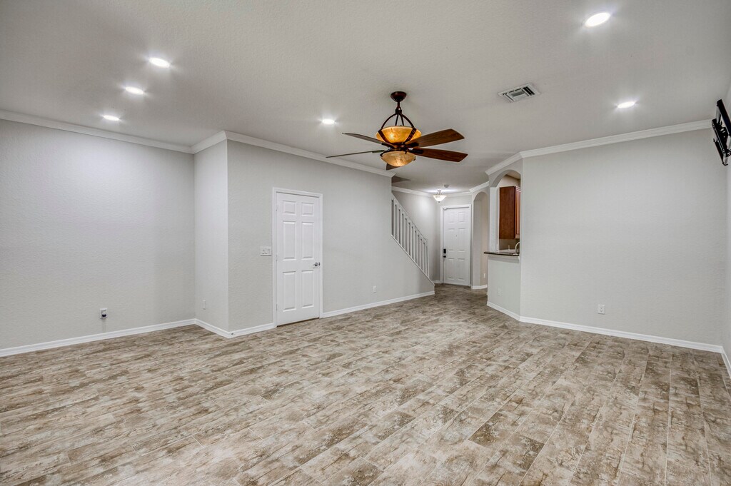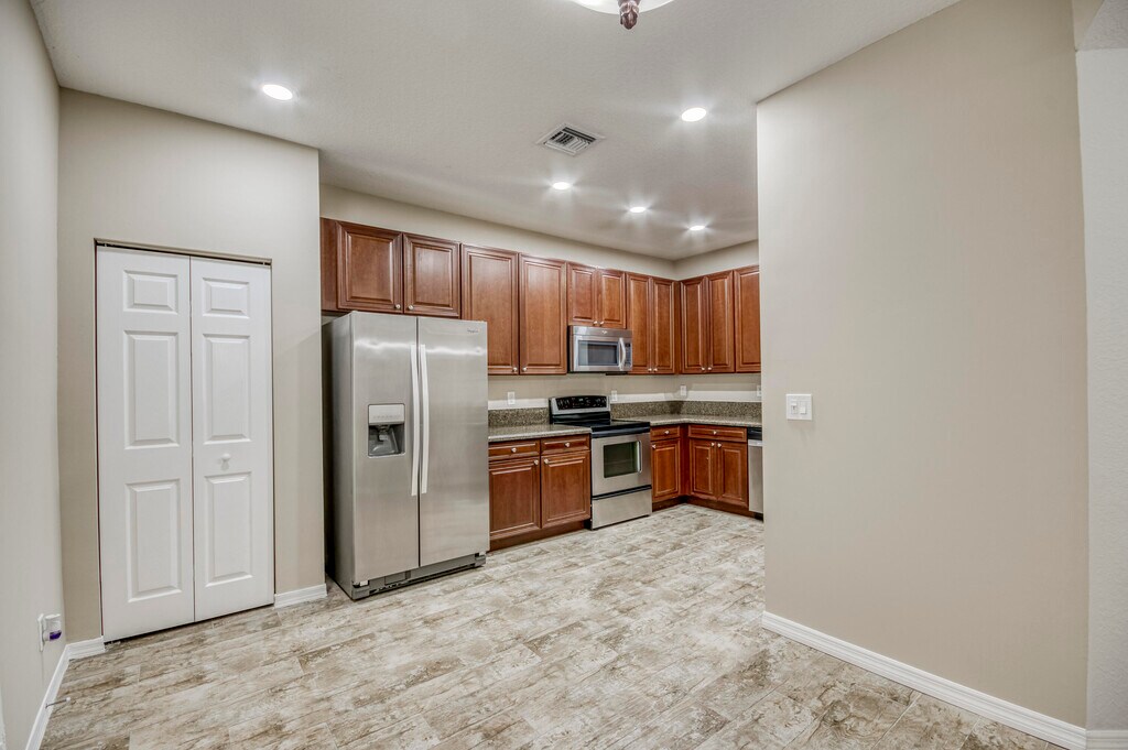 This beautiful 3-bedroom, 2.5-bath townhouse is located in a gated community and offers numerous upgrades throughout. The kitchen features stainless steel appliances and granite countertops, complemented by freshly painted interiors and newly added recessed lighting for a modern touch. The spacious family room is perfect for entertaining, while the primary bedroom easily fits a king-size bed and includes a large walk-in closet, abundant natural light, and a luxurious en-suite bathroom. Rustic wood-look porcelain tile floors run throughout the home, creating a warm, contemporary feel. Step outside to a private and spacious back patio, now featuring brand-new turf, ideal for relaxing or entertaining. Enjoy the peaceful sounds of birds from the nearby sanctuary as you unwind in this