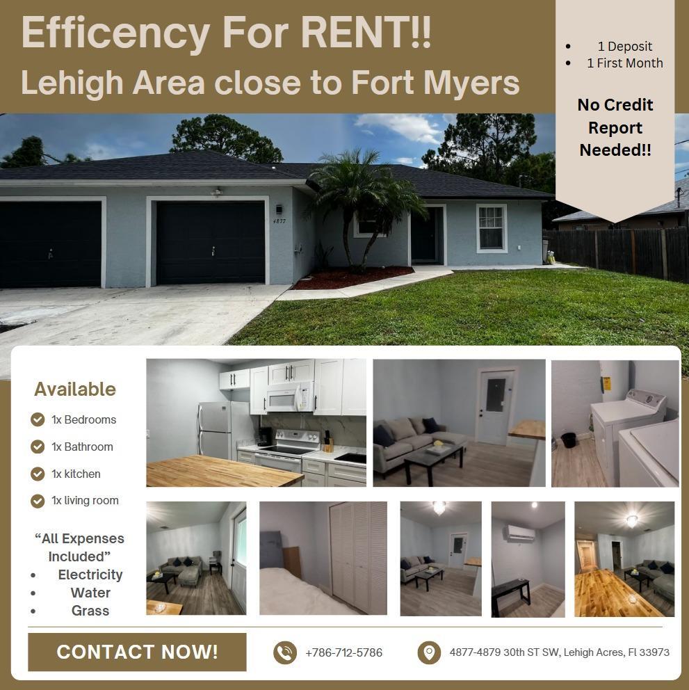 **One Unit For RENT!! - Lehigh Acres (Close to Fort Myers)** Looking for a cozy and affordable living space? Look no further! This Unit in the quiet Lehigh Acres area, just minutes from Fort Myers, is available for rent! **Unit Features:** * **1 Bedroom** * **1 Bathroom** * **Kitchen* **Living Room**and Laundry for relaxation and comfort * *Grass maintenance* **Rent**: \$1,100/month * **Deposit**: \$1,100 * **No Credit Report Needed!**. Enjoy the convenience of the proximity to Fort Myers. **Location:** 4879 30th St SW, Lehigh Acres, FL 33973 **Contact:** Call or text + for more details or to schedule a tour! **One Unit For RENT!! - Lehigh Acres (Close to Fort Myers)** Looking for a cozy and affordable living space? Look no further! This Unit in the quiet Lehigh Acres area, just minutes from Fort Myers, is available for rent! **Unit Features:** * **1 Bedroom** * **1 Bathroom** * **Kitchen* **Living Room**and Laundry for relaxation and comfort * *Grass maintenance* ...