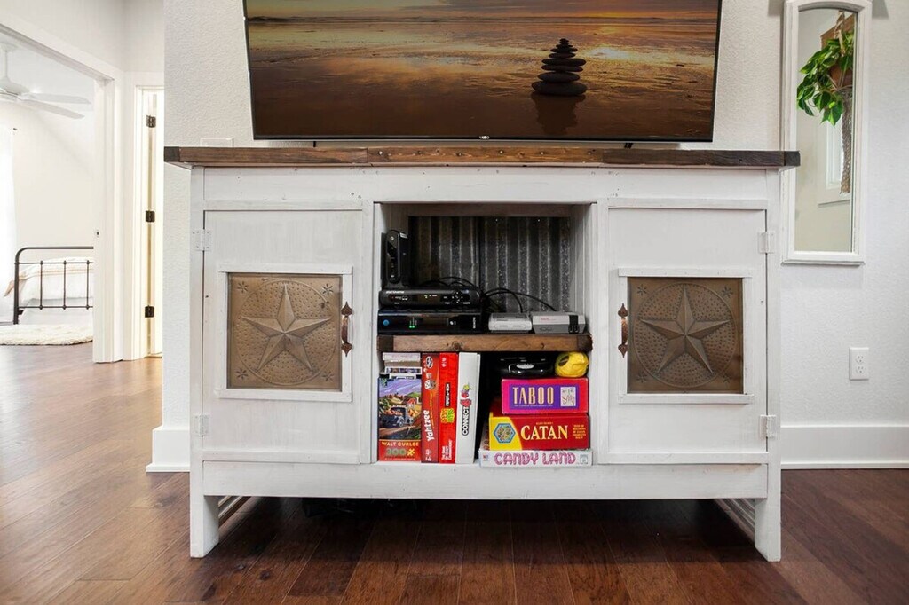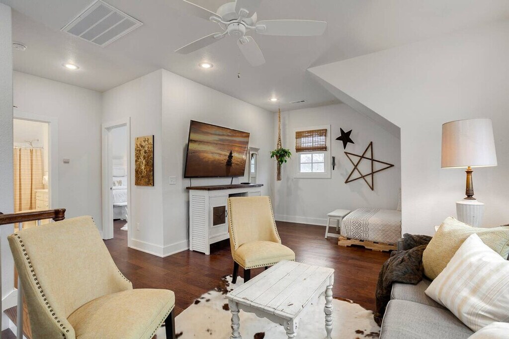 Experience style, relaxation, and recreation at SoFay Farmhouse, located in South Fayetteville. This charming 4-bedroom, 2.5-bath home accommodates up to 8 guests and is ideally situated just half a mile from the town square and a mile from the University of Arkansas. With three generous Smart TVs, a porch swing on the patio, a BBQ grill, cozy reading and lounging corners, kid-friendly spaces, and classic vintage video games, you'll feel at home in this delightful farmhouse. The farmhouse boasts two inviting living spaces and a fully stocked kitchen equipped with top-of-the-line appliances. Enjoy the furnished wrap-around porch for cookouts or morning coffee. The downstairs primary bedroom features a king-size Tempurpedic bed, Smart TV, seating, and an en-suite bathroom with a jacuzzi tub. Upstairs, you'll find a southeast bedroom with a queen-size Tempurpedic bed, desk/vanity, and blackout blinds, as well as a north bedroom with a queen-size Tempurpedic bed and vintage decor. The cozy loft offers a full-size bed in a snug nook. Dining space is available for 6, with additional kitchen bar seating for 3. This pet-friendly property allows dogs with a maximum of 3, requiring a fee of $90 per dog to be paid prior to your stay. Dogs discovered at the property without prior notice or cats discovered at the property will incur a fine of $400. A gas grill is available for guest use, and grilling tools and utensils can be found in the laundry room. Nestled in the booming South Fayetteville district, the farmhouse is surrounded by new construction and a vibrant community. Enjoy leisurely walks with locals and experience southern hospitality. The property is conveniently located just a couple of miles from I-49, and a mile from the University of Arkansas and downtown Fayetteville. Onsite parking is available, with street parking as an option. The property is equipped with NoiseAware technology, ensuring privacy compliance. Check-in is any time after 3:00 PM. Unauthorized parties or events will result in a $1000 fine, and unauthorized checkout delays will incur a fine of $100 per hour. This is a non-smoking home, with a $1000 fine plus smoke remediation costs for violations. Pets are not allowed on the furniture, and must be kept in the mudroom if unattended. Quiet hours are from 10:00 PM to 10:00 AM. Trash day is Thursday morning, so if you're staying on a Wednesday night, please take it to the curb with the recycling. [SI]
