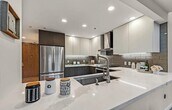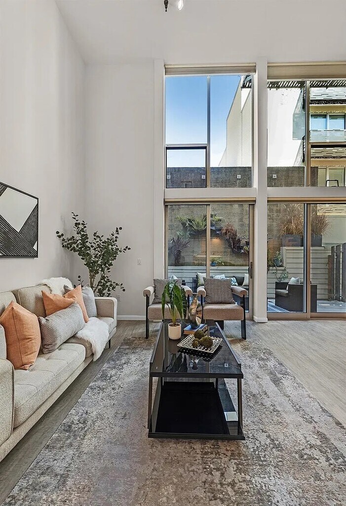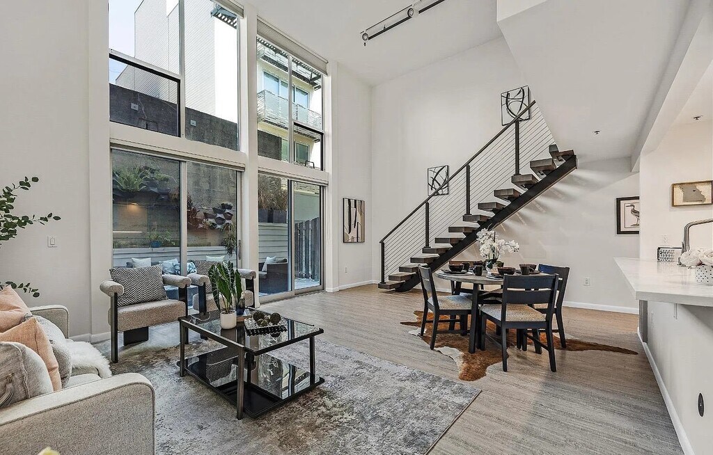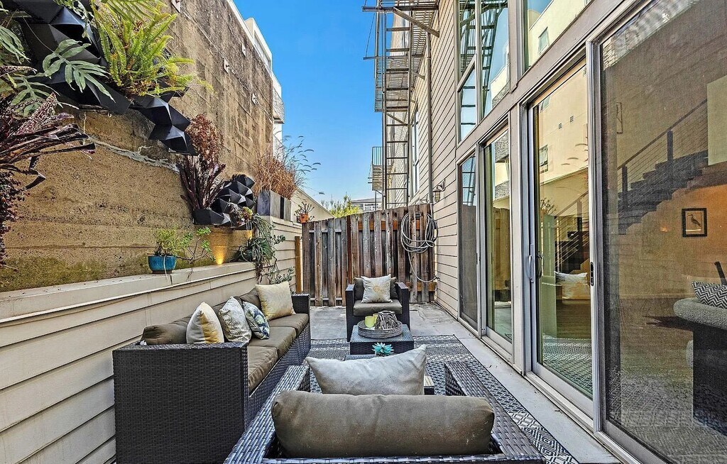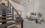 quiet loft with sunny, secluded patio, ideally located 1 block from Caltrain. This modern loft features clean, high-end finishes, excellent light and tons of storage throughout. ; Spacious open and airy bi-level floor plan ; Wall of floor-to-ceiling windows offering excellent exposure throughout the day ; Large, secluded, sunny private patio directly accessible from living area, perfect for barbecues ; Soaring ceilings with custom pendant halogen lighting in living area and over kitchen bar ; U-shaped kitchen with maple cabinetry, convenient granite breakfast bar and modern stainless steel appliances including refrigerator, dishwasher, oven/range and garbage disposal ; Curved mezzanine loft bedroom with large walk-in closet ; Roomy, tiled bathrooms with additional space for storage ; Additional storage underneath stairs ; Hall closet downstairs ; Window coverings included ; Maple hardwood floor in living areas