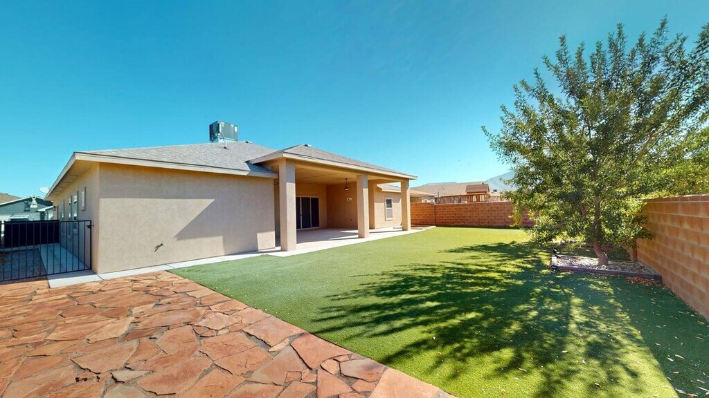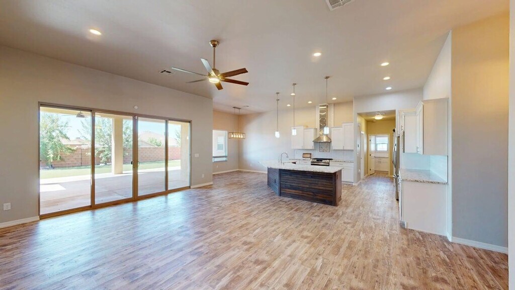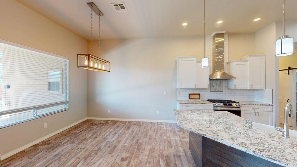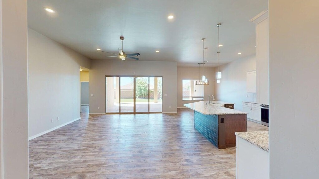 This modern 4-bedroom, 3-bath home features a bright open layout with high ceilings and stylish vinyl plank flooring throughout. The kitchen is well-equipped with granite countertops, stainless steel appliances, and generous cabinet space—ideal for cooking and entertaining. The primary suite includes a large walk-in closet, dual vanities, and a walk-in shower. Outside, enjoy an oversized patio and a low-maintenance turf yard. A 3-car garage offers additional parking and storage.