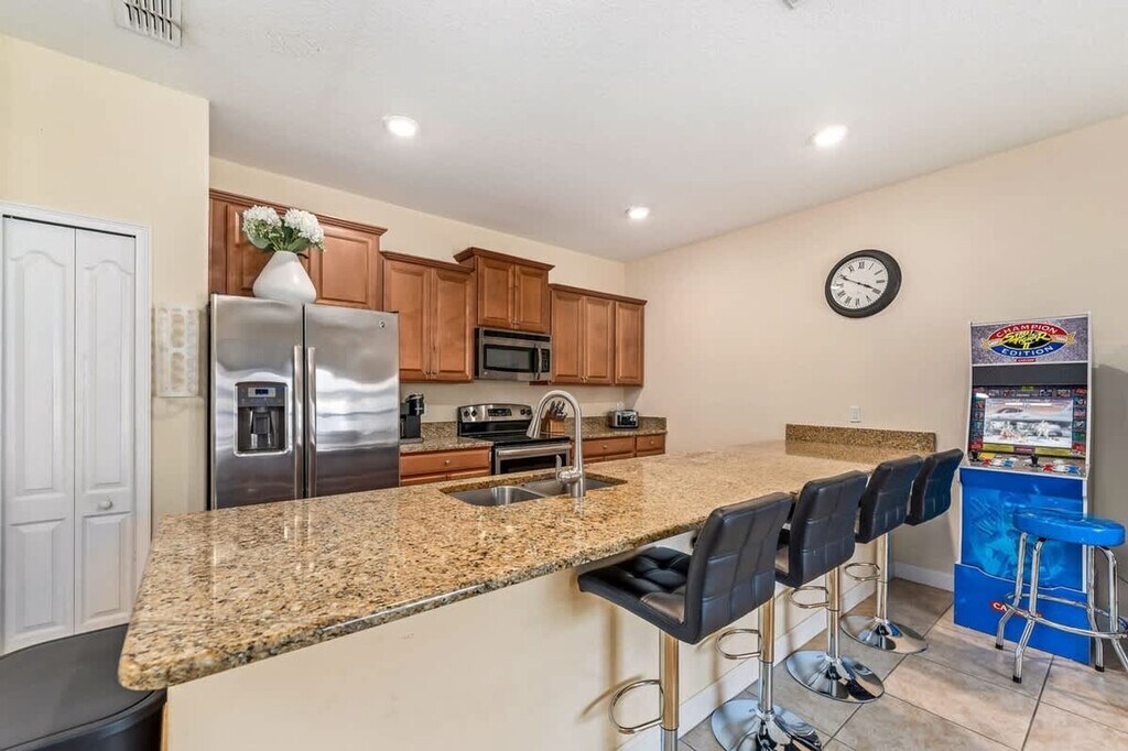 Welcome to a relaxed Florida getaway where space, comfort, and resort fun come together for an easy stay with family or friends. Feel at home in this townhome that comfortably accommodates up to 12 guests. This entire townhome spans two floors. The open floor plan connects the living and dining areas to the kitchen, creating a natural gathering place for meals, games, and downtime. Arcade games add a playful touch, making it easy to keep everyone entertained. Air conditioning and heating keep the space comfortable year-round, and Wi-Fi and a TV are available for quiet nights in. The kitchen is designed for guests who enjoy preparing their own meals. A washer and dryer are available for added convenience during longer stays. Step outside to a patio or balcony area where you can enjoy fresh air. A BBQ grill and outdoor dining space make it easy to keep meals simple and social. Guests have access to shared pools, a hot tub, a lazy river, a splash pad, water slides, and a gym. Free parking is available on the premises and on the street. Set in Kissimmee, Florida, the townhome is a short drive from Disney and other major attractions. The surrounding area offers restaurants, shopping, and easy access to Central Florida highlights, making it simple to plan each day without long commutes. Storey Lake Resort offers an ideal retreat, combining relaxation, upscale living, and exciting activities. Warbird Air Museum is approximately 3.6 miles away, SeaWorld Orlando is about 4.9 miles from the property, Disney’s Boardwalk is roughly 5 miles away, and Lakefront Park is just around 5 miles from the location. There is absolutely no smoking and no drugs allowed inside the home or elsewhere on the property. Only the number of guests indicated on the reservation are allowed to stay overnight on-premise, unless otherwise agreed upon in written form. The number of vehicles on property should never exceed two per reservation. Please respect the neighborhood and neighbors and keep excessive noise to a minimum between 10 pm and 8 am. No fireworks of any kind and no firearms on property, unless kept locked in vehicle. Check-out time is 10:00 AM. Guests who remain past the designated check-out time may be subject to a late check-out fee of up to $300. [SI]