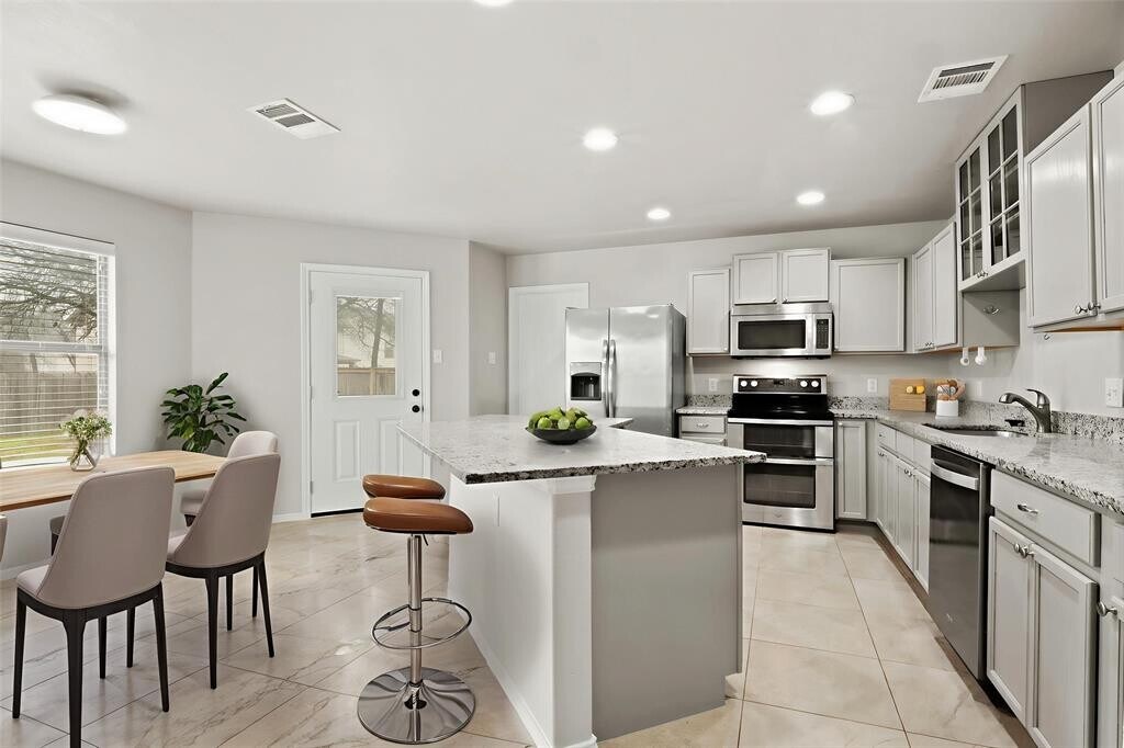 Quick Move-in Possible! This distinctive two-story home has been lovingly and meticulously maintained by conscientious owners and offers a modern, inviting feel throughout. The spacious great room features wood laminate flooring and a cozy fireplace with mantle and tile surround, creating the perfect space to relax or entertain. All four bedrooms are located upstairs, while a private study just off the main living area provides flexible space that could easily serve as a home office or workout room. The remodeled kitchen is a true standout with gray-painted cabinetry, a large seated bar, stainless steel appliances (refrigerator included), and an oversized walk-in pantry that feels like a room of its own. Step outside to a generous backyard ideal for entertaining or play, complete with a relaxing patio for unwinding. Ideally located just one block from Ford Elementary, with a scenic 0.4-mile hike to Georgetown Lake via Woodlake Park, and close to the new Sprouts Grocery and HEB for everyday convenience.