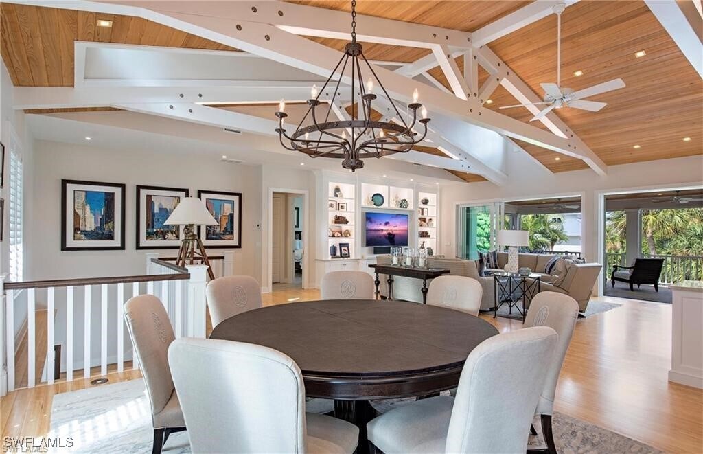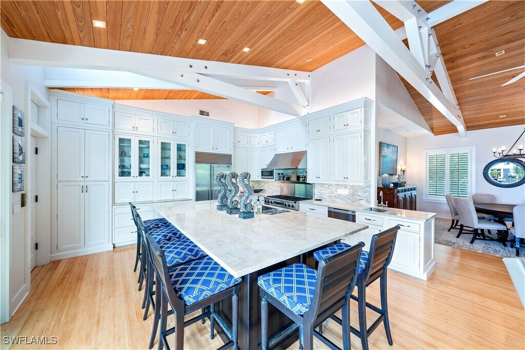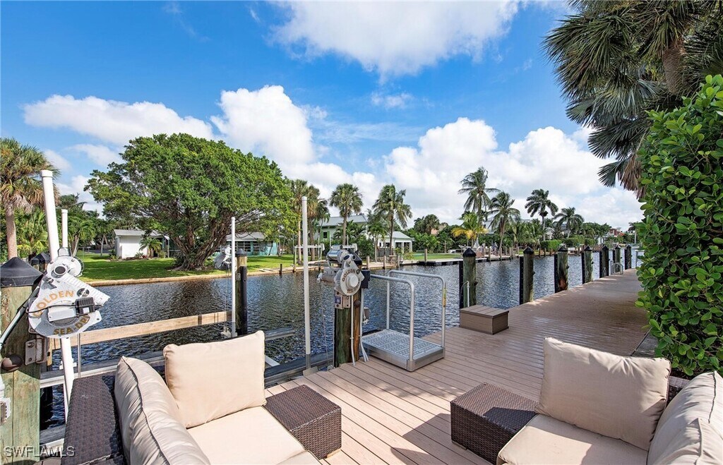 Discover the essence of waterfront luxury in this beautifully reimagined coastal home,ideally situated in the prestigious Aqualane Shores community. Just a short stroll from the vibrant 3rd Street district and the iconic Naples Pier,this 5-bedroom,5.5-bath residence offers a seamless blend of modern elegance and relaxed coastal living. The lower level is designed for both comfort and entertainment,featuring a spacious lounge area with a flat-screen TV,a convenient kitchenette,a laundry room,and three inviting guest bedrooms,each with a queen bed,along with two stylish bathrooms. Upstairs,an open and airy floor plan showcases a sophisticated living and dining space,complemented by a state-of-the-art chef’s kitchen with a gas range and high-end appliances. The luxurious primary suite offers a private retreat with a king bed,spa-like bath,oversized walk-in shower,freestanding soaking tub,and an adjacent office space. A secondary guest suite on this level includes twin beds and a private bath. Thoughtful details such as rich bamboo flooring,exquisite tile finishes,and exposed beam ceilings add to the home’s charm. Step outside to embrace the Florida lifestyle—whether lounging by the resort-style pool,unwinding on the covered wraparound balcony with tranquil water views,or setting off from your private dock for a day on the Gulf. This exceptional Naples getaway is ready to welcome you! January and April 2026 are available at $40,000/month,May through October at $25,000/month,November at $30,000/month,and December at $35,000/month.
