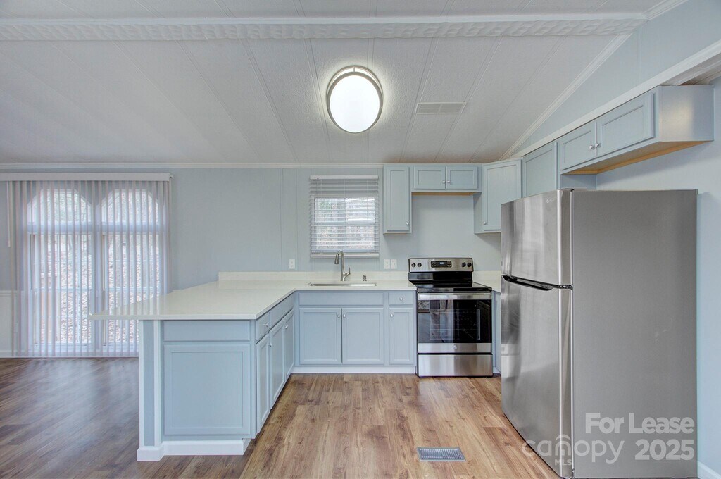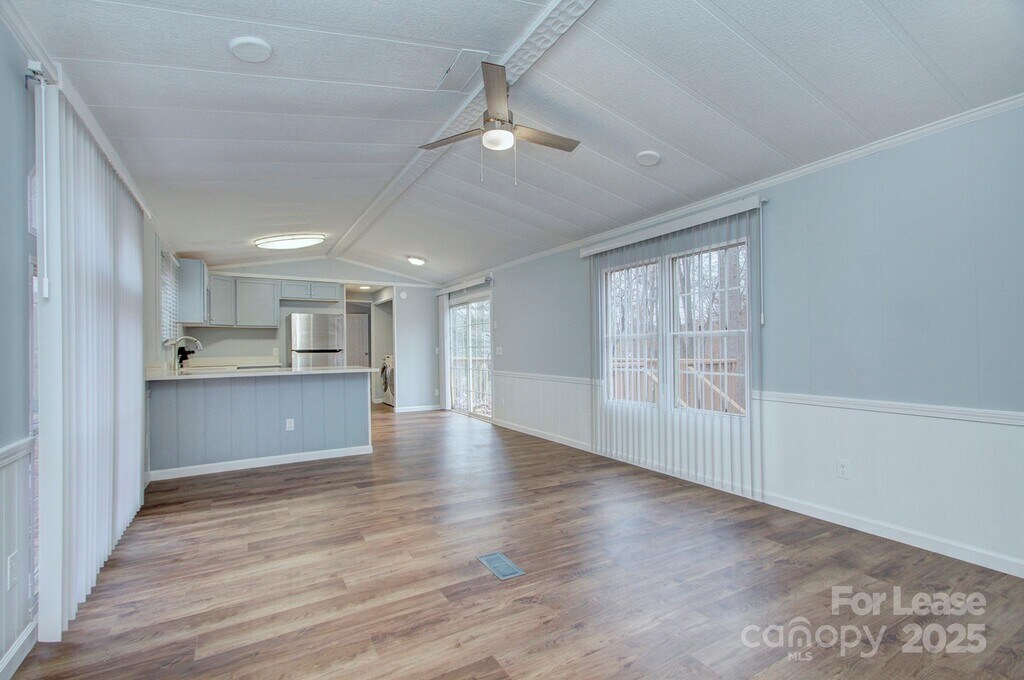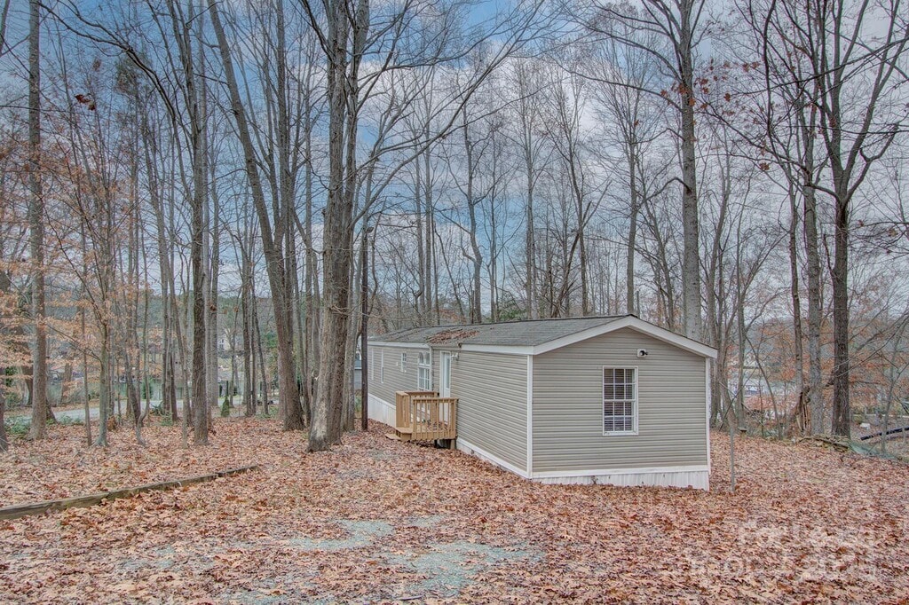 Nestled on a spacious,private wooded waterfront lot,this totally updated manufactured home offers the perfect blend of comfort and style. The open floor plan features vaulted ceilings in the living room and primary bedroom,creating an airy and inviting space. LVP flooring and updated lighting flow seamlessly throughout the home,adding modern touches. The updated kitchen boasts painted cabinets,quartz countertops with an undermount sink,and stainless steel appliances,including a refrigerator. Enjoy lake views from the large back deck,ideal for relaxing or entertaining. The split-bedroom layout provides privacy,with the primary suite featuring a walk-in closet,en-suite bath with garden tub,and ceiling fan. The secondary bedroom includes a built-in desk,perfect for work or study. A washer and dryer are also included,making this home move-in ready. Don't miss this opportunity to own a serene retreat with stunning lakefront views!