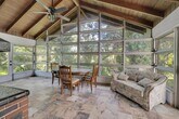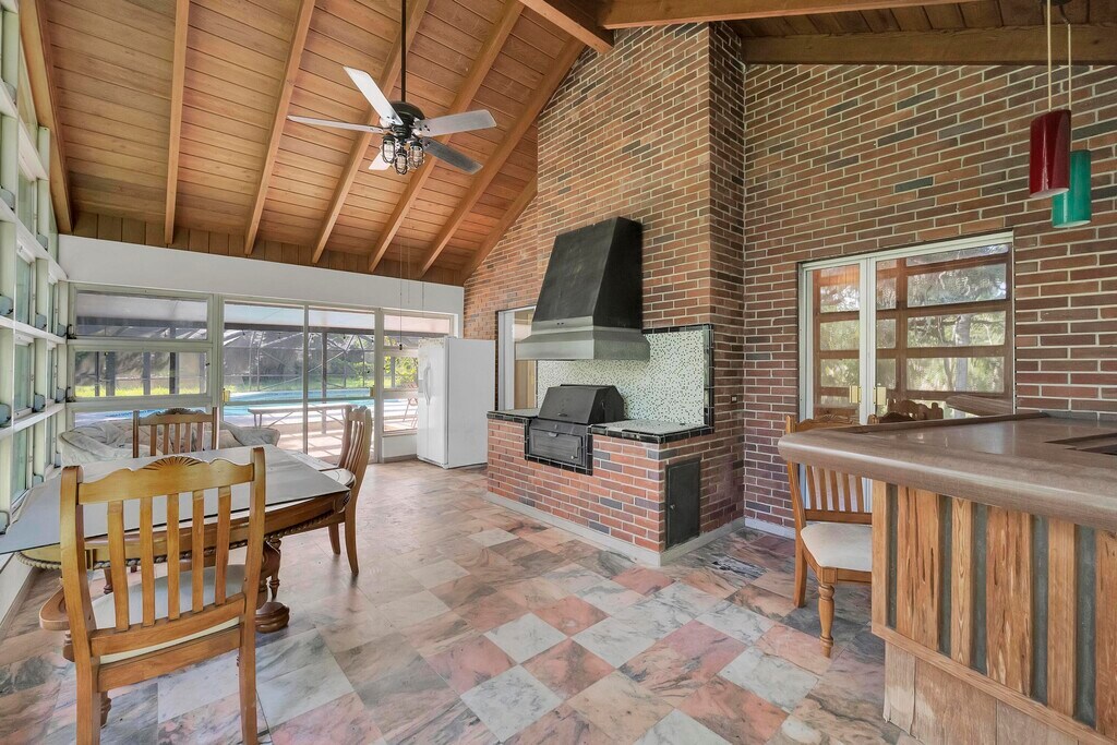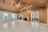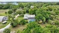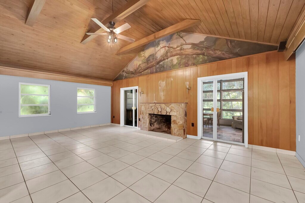Private 13.7 acre Old Florida property with a 3 bedroom, 3 bathroom CBS pool home. Features include a metal roof, tile flooring, spacious living areas, and multiple flex rooms for office, storage, or hobby use. The kitchen offers abundant cabinets, stainless steel appliances, and a passthrough to the dining area. The main living room has vaulted wood ceilings, exposed beams, and a wood-burning fireplace. Enjoy a large enclosed Florida room overlooking the screened pool and surrounding greenery. Exterior features include a covered patio, mature trees, wide yard space. Located east of I-95 with privacy while still close to shopping and main routes.