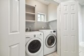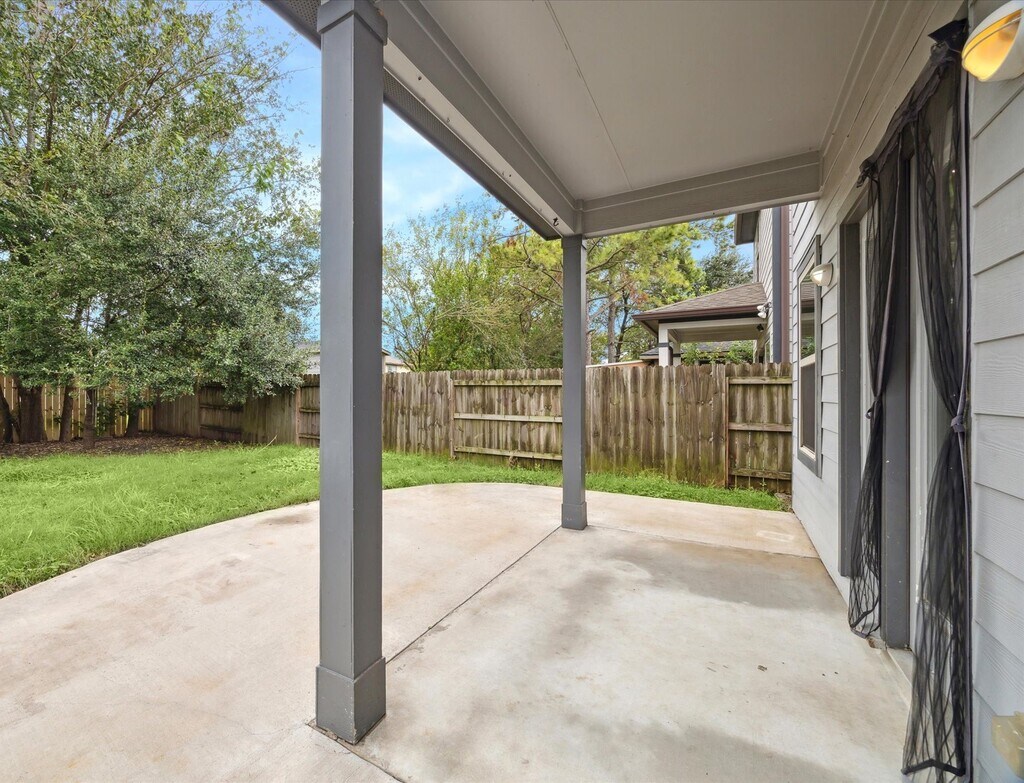 A curved staircase and railing encircles the two-story entry,well-illuminated by large windows. Tile floors throughout the first floor reflect light from numerous windows. Large living and kitchen open to a covered patio in the fenced yard with large shade tree. The open floor plan with elevated ceiling,maximizes space and is seamless with the spacious kitchen with gas cooktop and pantry. White tile backsplash,granite counters and nice stainless steel appliances (including refrigerator) create a striking space. A center island provides storage and seating for dining and entertaining. A full size washer and dryer are concealed behind double doors,in the hall to guest bath and garage. The sizable second floor primary suite with numerous windows and walk-in closet has a private bath with dual sink granite vanity and standalone shower. Secondary bedrooms with large windows and plush carpeting,share a hall bath. MLS# 91404626