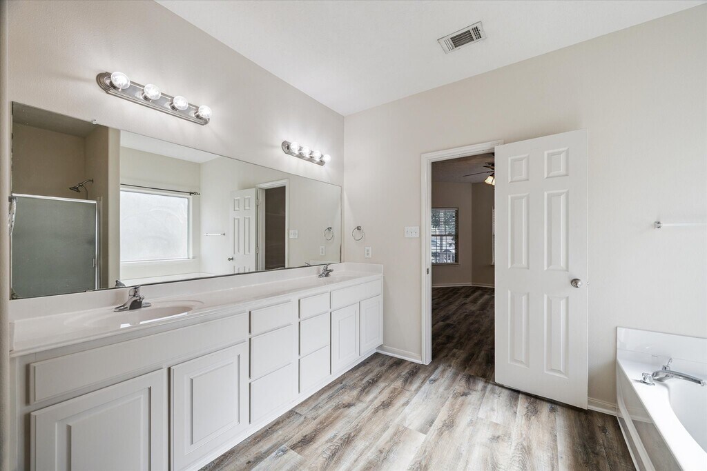 Spacious home with easy access to the Grand Pkwy and I-45. Your new home has 2 living areas so you can spread out and a bonus office cubby upstairs. You will love the large kitchen that is open to your living room and breakfast room. Your new kitchen has storage galore with multiple pantries including an enormous walk-in pantry under the stairs. Enjoy your private first floor oasis with the primary suite downstairs and guest bedrooms upstairs. The primary bedroom is enormous with equally large primary bathroom. Relax in your soaking tub then walk into your huge primary walk-in closet to get ready for the day. Large closets in each bedroom and ample storage. This home has it all and has room for everyone. Call your favorite realtor today and come home before this one is gone! ***Freshly painted walls,new vinyl plank flooring throughout first floor,and new carpet August 2025*** MLS# 8514092