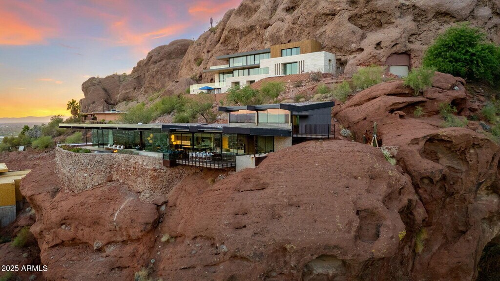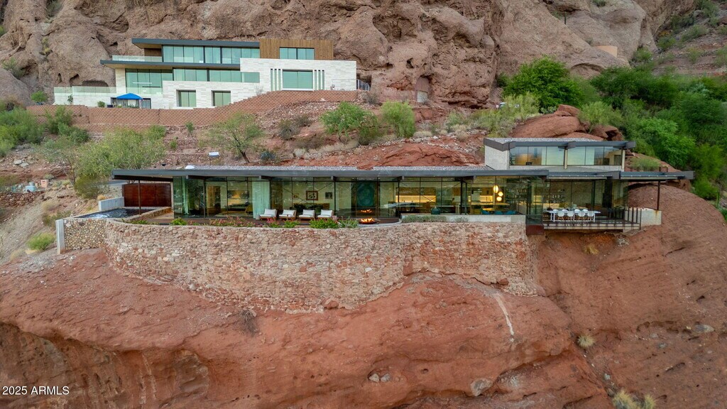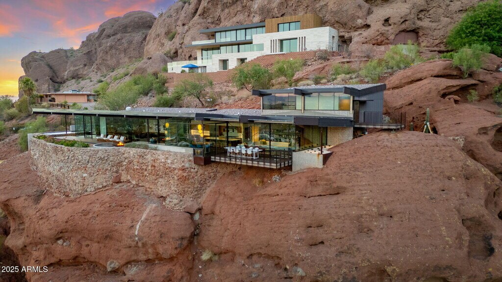 Mid-Century Modern Masterpiece on Camelback Mountain Perched high on the cliffs of Camelback Mountain,this breathtaking mid-century modern estate redefines luxury desert living. Built in 2018 and meticulously designed for seamless indoor-outdoor living,this 5,800 sq ft architectural gem captures sweeping mountain and city lights views from every angleespecially the dazzling Arizona sunsets. Floor-to-ceiling glass walls dissolve the boundaries between inside and out,allowing natural light and panoramic vistas to flow into every corner of the open-concept layout. The main living areas open effortlessly to expansive outdoor spaces,creating an entertainer's dream with multiple lounging and dining zones. The chef's kitchen is a true showpiece,featuring top-of-the-line appliances,sleek cabinetry,a massive island,and direct access to an outdoor kitchen for al fresco dining under the stars. Outside,the pool appears to float above the city,while a built-in fire pit with surround seating creates the perfect gathering space to soak in the skyline below. Every detail from the architectural lines to the carefully integrated landscape was designed to blend luxury with the mountain's natural beauty. With 5 spacious bedrooms and 5.5 bathrooms,this home offers both privacy and comfort on a rare 1.036-acre lot. Built high into the mountain,it provides unmatched elevation,exclusivity,and views that few properties in the Valley can rival. This is more than a homeit's a private retreat in the sky.