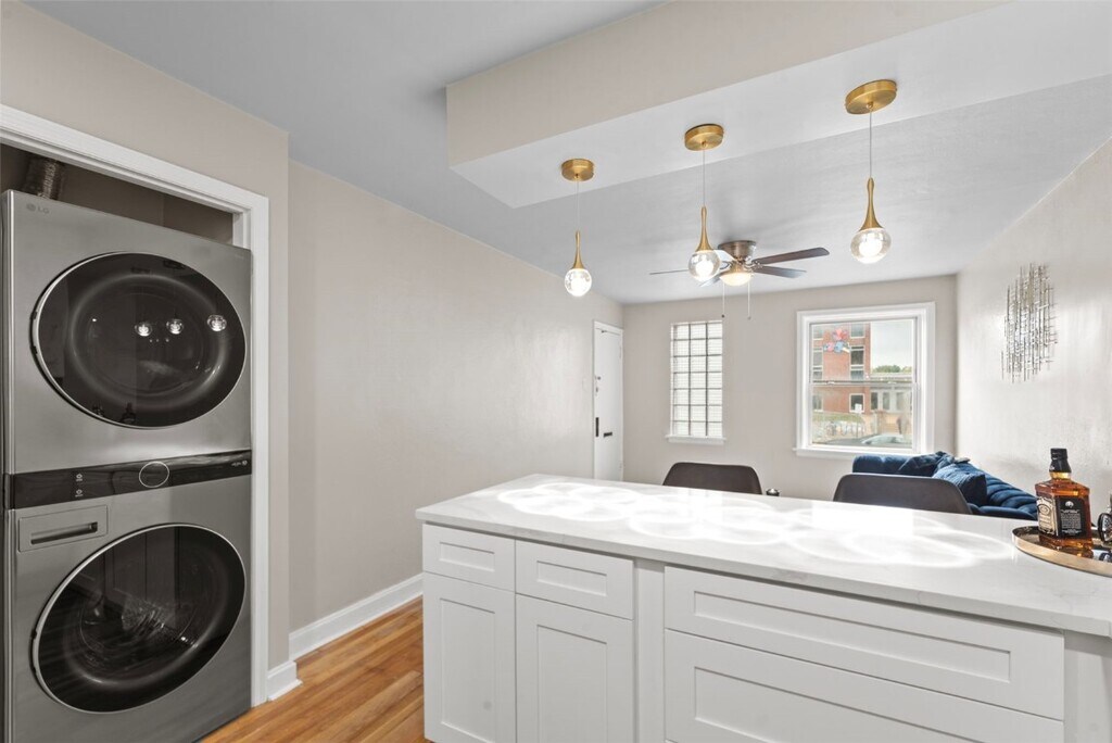 Welcome home to this fully renovated 1-bedroom, 1-bath unit in a charming 4-family building located in the heart of Southwest Garden. Every detail has been thoughtfully updated to combine classic warmth with modern luxury. Inside, you’ll find refinished original hardwood floors from the 1940s and a bright, open-concept living area that flows into a chef-inspired kitchen with soft-close cabinets, full granite backsplash, and a large eat-in island—perfect for entertaining or everyday dining. The space is complete with brand-new, never-used stainless-steel appliances throughout. Enjoy the convenience of smart living with a 4th-generation Google Nest Learning Thermostat, Eufy smart lock featuring fingerprint, keypad, and phone access, and an LG ThinQ smart washer and dryer with built-in AI. Designer snowflake pendant lights add a subtle touch of elegance and personality. The bathroom showcases modern tilework, gold fixtures, and a sleek vanity, while the bedroom provides plenty of natural light and a peaceful retreat. Additional perks include off-street parking, energy-efficient systems, and an unbeatable location—just minutes from Tower Grove Park, The Hill, and the Missouri Botanical Garden.