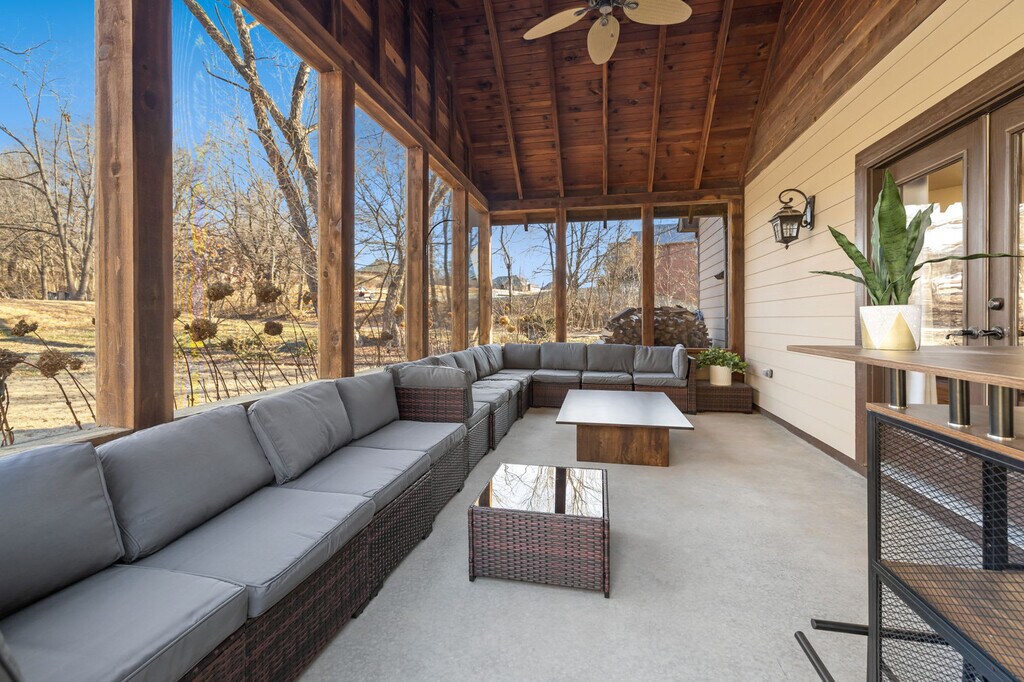 Welcome to Whispering Brook, a peaceful and secluded 4-bedroom home with an outdoor oasis. Feel at home as you take in the serenity of the private stream that runs through the yard from the furnished patio or the large screened-in porch. Inside, the open living space boasts elegant decor, a stone fireplace, a fully stocked kitchen with a large dining table, and a grand piano. Located in Johnson, it's just a quick drive to Fayetteville or Bentonville and only 1 mile to The Johnson Square with several of Northwest Arkansas's best restaurants. This home features a gorgeous patio covered in greenery with a porch swing, dining table, and an outdoor shower available in warmer months. The large screened-in patio offers cozy seating and a bar cart, perfect for gathering with friends. The living room, with its tall ceilings, stone fireplace, large Smart TV, and grand piano, provides a luxurious space for relaxation. The fully stocked kitchen includes local Onyx coffee, and the elegant dining table offers ample space for meals. The home includes three private bedrooms with attached full bathrooms, featuring King, King, and Queen beds, and a large bonus room upstairs with a Smart TV, couch, and two bunk beds. Nestled in the heart of Northwest Arkansas, this home is surrounded by amazing local restaurants, shops, and popular bike trails. Whether visiting the University or exploring local eats, there's something for everyone. Public transit, bike trails, and rideshare options are available for easy transportation. This property is not pet-friendly, and pets discovered at the property will incur a fine of $400. No parties or events are allowed unless pre-arranged with the host, with an event fee paid. Unauthorized parties will result in a $1000 fine. This is a non-smoking home, and smoking will incur a $1000 fine plus smoke remediation costs. Check-in is any time after 3:00 PM, and unauthorized checkout delays will incur a $100 per hour fine. Quiet hours are between 10:00 PM and 10:00 AM. [SI]
