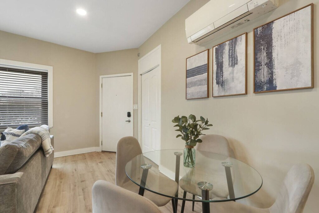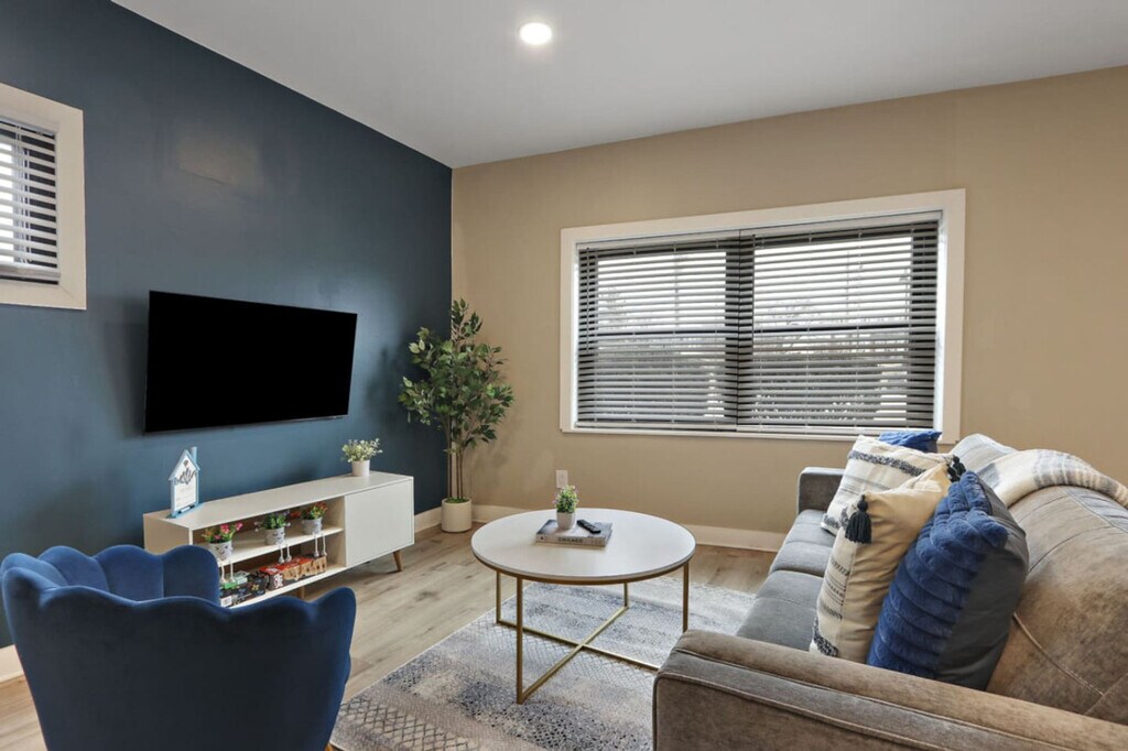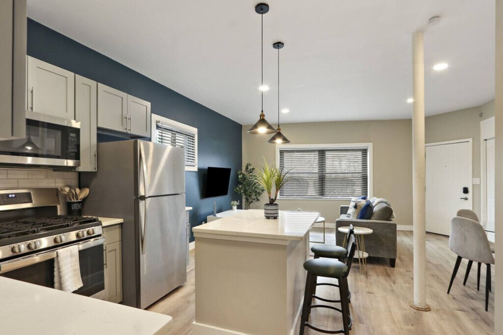 Feel at home in this recently upgraded apartment, featuring brand new furniture, flooring, and design completed in April 2025. This home is perfect for a business trip or family vacation. The vibrant living area includes a Smart TV and board games for entertainment. The fully equipped kitchen features a drip coffee bar, spices, pots, pans, and a dedicated dining area for four. You'll also find modern 1.5 bathrooms with towels, linens, toiletries, a hair dryer, and an in-unit washer and dryer with detergent provided. Enjoy the convenience of a free, dedicated parking spot. Come home from a busy day exploring the Morton Arboretum, downtown Naperville, and Oakbrook Center, all within 15 minutes. The apartment is also in close proximity to the Metra train station, with a short commute to downtown Chicago. Minutes away you will find a wide variety of restaurants, nightlife, grocery stores, and shopping. Strictly no parties, smoking (of any kind), or property damage is allowed, or you will be subject to a $500 fine. As the apartment is located close to the train station, people with sensitive hearing may be bothered by the occasional train sounds. White noise machines are provided to bring you additional comfort, but please consider this before booking. Aggressive dog breeds or dogs weighing over 100 pounds are not allowed. Includes a dedicated at-home workstation with high-speed Wi-Fi for your business needs. [SI]