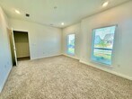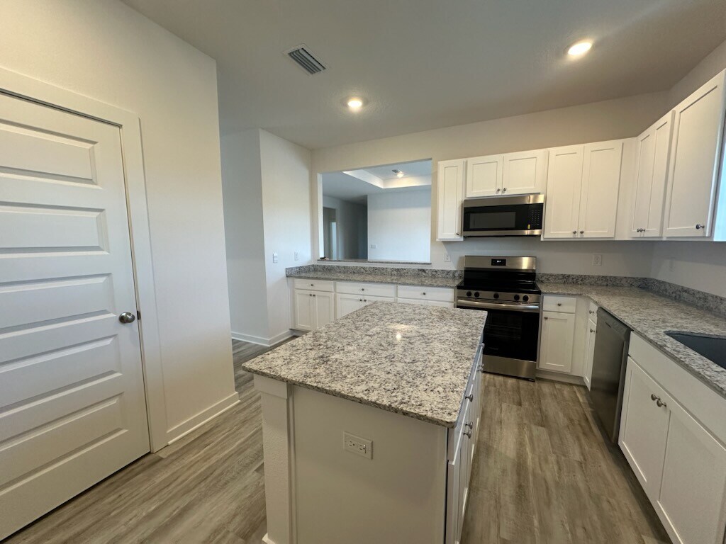 This brand-new three-bedroom, two-bathroom cottage-style home is located on a corner lot in the Owl's Head East community of Freeport. The home is designed with modern finishes and everyday comfort in mind. The spacious family room serves as the central gathering area, offering plenty of room for both relaxing and entertaining. The kitchen features white cabinetry, granite countertops, and a convenient pass-through window that connects to the living room, while the separate dining room provides flexibility and can be used as a home office or an additional living space. From here, you can step out to the large covered patio, a perfect spot for outdoor dining or unwinding at the end of the day. Interior finishes include EVP flooring in the main living areas, carpet in each bedroom, and granite countertops in the kitchen and bathrooms. The primary suite offers an ensuite bathroom with dual vanities, a walk-in shower, and a spacious closet, while the two additional bedrooms share a full bath. The rear-entry two-car garage adds to the home's curb appeal while offering practical access. Residents of Owl's Head East enjoy a community setting that includes a wooded park and a walking trail, creating a peaceful environment to call home.