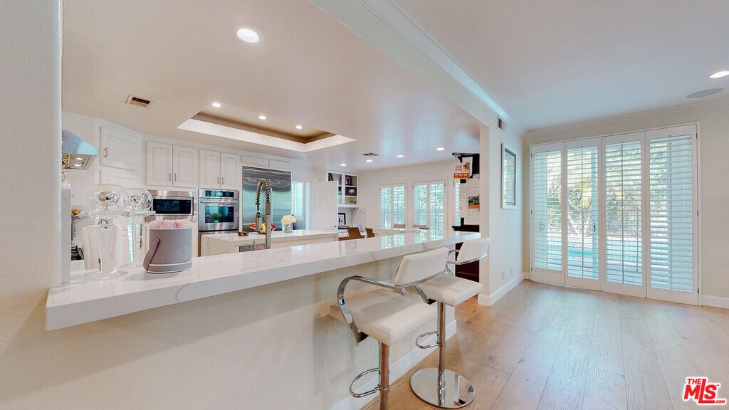 This exceptional residence offers refined style and an ideal layout for both everyday living and entertaining. The home features five en-suite bedrooms and six bathrooms, a four-car garage, and a beautifully landscaped yard complete with a pool and spa. Ideally located in Encino within the sought-after Hesby Oaks Leadership Charter School district (K8).Step inside to a light-filled interior highlighted by soaring pitched ceilings and a seamless flow. The main level includes a sophisticated formal living room, adjacent bar area, elegant formal dining room, and a center-island kitchen with new stainless steel appliances that opens to a spacious family room. Also on this level are a powder room and a versatile en-suite bedroom, perfect for guests or a home office.A dramatic spiral staircase leads to the upper level, where you'll find four additional en-suite bedrooms, including an expansive primary suite featuring dual walk-in closets and a luxurious bathroom with double vanities, a jacuzzi tub, and a separate water closet with bidet. The second floor also offers a convenient laundry room, along with abundant built-ins and storage throughout. MLS# 26677899