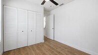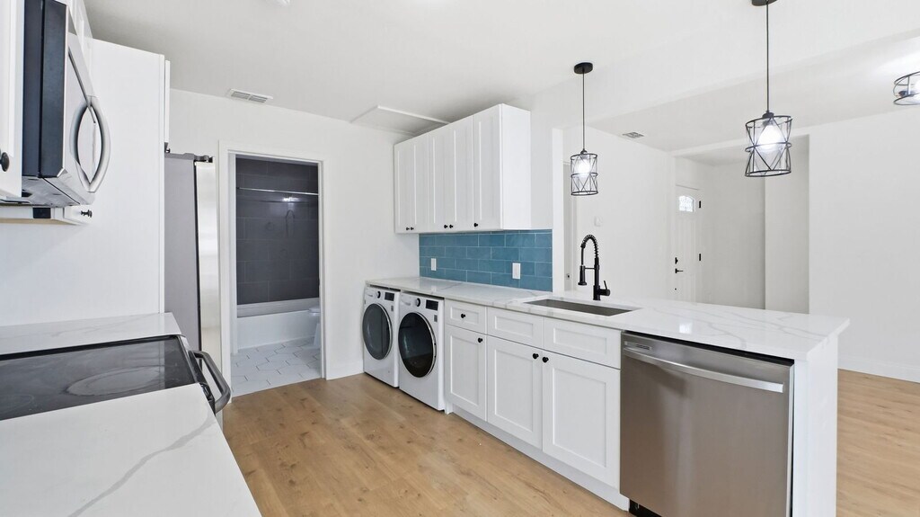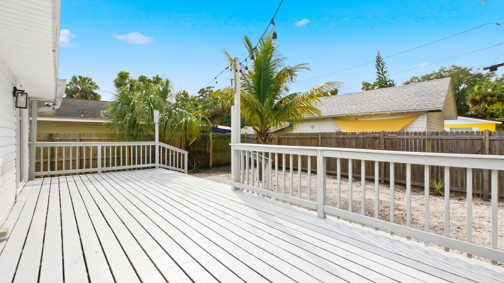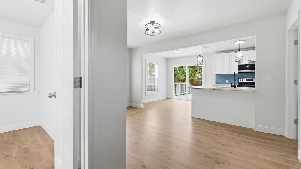Fall in love with this charming and beautifully updated 2-bedroom, 1-bath home bursting with character and style! From the moment you step inside, you'll be greeted by an inviting open layout featuring warm wood laminate flooring that flows seamlessly throughout. The spacious living area opens to a stunning kitchen highlighted by a blue tile backsplash, sleek black fixtures, crisp white cabinetry, and sparkling marble countertops—all centered around a cozy overlook island, perfect for entertaining or enjoying your morning coffee. A cabinet washer and dryer add extra convenience without sacrificing style. The versatile second room offers endless possibilities, ideal as a guest bedroom, home office, or creative studio to suit your lifestyle. The main bathroom feels like a private spa, featuring elegant gray shower tile, wood accents, modern black hardware, and eye-catching hexagon flooring. Step through the kitchen to your own tropical backyard oasis, complete with a spacious deck surrounded by swaying palm trees and decorative shell ground cover—the perfect place to relax, grill, or unwind under the Florida stars. Rent is $2,100 per month, grounds care included. Tenant responsible for Electric, Water/Sewer/Trash and Cable/Internet. First months rent and Security required for move in with approved application. All occupants 18 years or older must apply. Small dogs (35 lbs. or less) are welcome with a $500 pet deposit and $50 monthly pet rent. NO CATS. This home perfectly blends modern updates with coastal charm—a must-see retreat that's ready to welcome you home! By submitting your information on this page you consent to being contacted by the Property Manager and RentEngine via SMS, phone, or email.