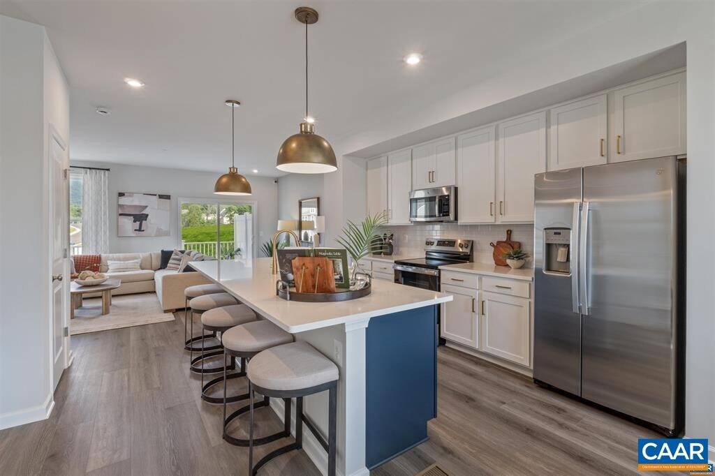 Enjoy amazing MOUNTAIN VIEWS in one of the BEST homes in Pleasant Green! This is an end unit,corner lot true 4 (FOUR!) bedroom,3.5 bathroom home. Only 1 year old and gently lived in home! An abundance of natural light floods every floor thanks to the end unit windows,and light color LVP flooring. Open concept main level features separate living and dining rooms,well-appointed kitchen with quartz & GE stainless steel appliances,two closets/pantires,and 10 foot long breakfast bar,plus a 11x17 balcony space allowing for plenty of space for your grill,outdoor table set,and plants. Primary bedroom suite w/ unbeatable mountain views and en suite bathroom with double sink vanity and walk-in closet. The bedroom level is rounded out by large side-by-side laundry closet with storage,desk nook,full bath w/ double sink,and two more bedrooms. Additional ground level true 4th bedroom en suite includes a full bathroom and direct access to the grassy backyard. Great storage throughout plus a one car attached garage. Phenomenal Crozet location WALKABLE to downtown amenities and restaurants. Western Alb schools. 20 minutes to Cville! **Pics are of a model unit w/ upgrades that we do not have! MLS ID 673748