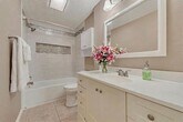 Completely updated lease home featuring renovated bathrooms, updated flooring, updated countertops, modern cabinetry, and stylish finishes throughout. The open floor plan offers a spacious breakfast area, a large kitchen overlooking the living room, soaring vaulted ceilings, and abundant natural light. The kitchen includes a new refrigerator, a newly installed built-in wine cooler, a GE gas stove, and smart appliances with Wi-Fi connectivity. All rooms are wired for Cat5 high-speed internet. The oversized primary suite features vaulted ceilings, a spacious ensuite bath, and a large walk-in closet with abundant storage. The secondary bedrooms are privately separated from the primary suite and share a full, updated bathroom. Additional highlights include an oversized 2-car garage with an EV charging station, built-in cabinets, extra storage space, a washer and dryer, a detached barn-style storage shed, and a recently replaced air conditioning system. The backyard also includes a large 8 x 8 storage shed. The home is wired for video surveillance, and the equipment will remain for tenant use. The kitchen door can be replaced with a standard door without a pet door if needed.