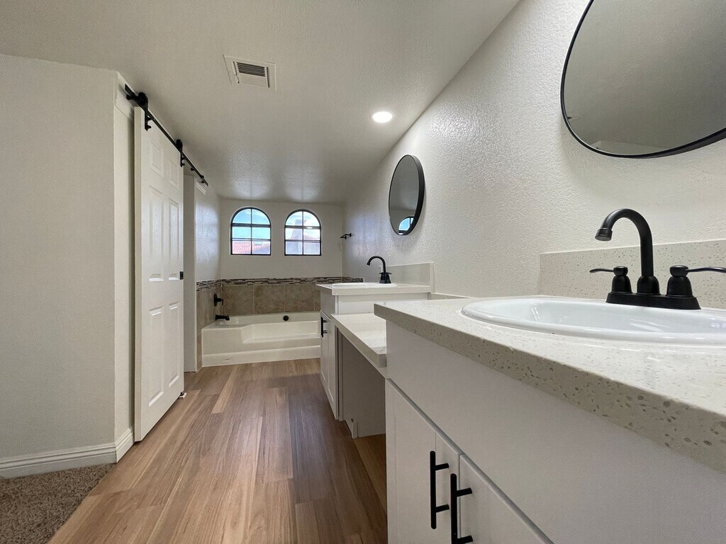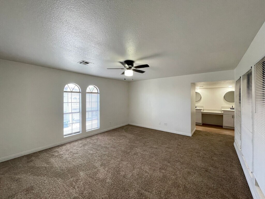 Modern 2-story townhouse with a 2-car garage featuring vinyl flooring downstairs and carpet upstairs. Enjoy ceiling fans throughout and a sleek kitchen with stainless steel appliances. Clean, contemporary, and move-in ready! Price includes $50 for trash and sewer.