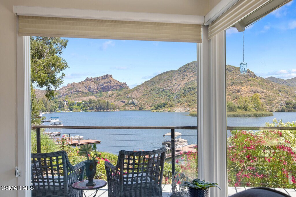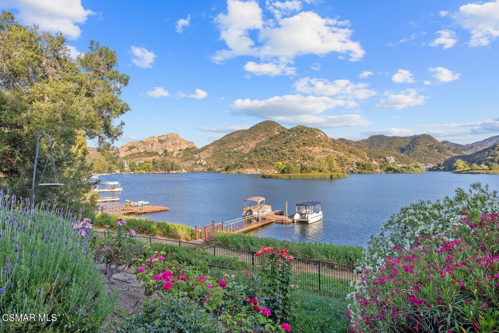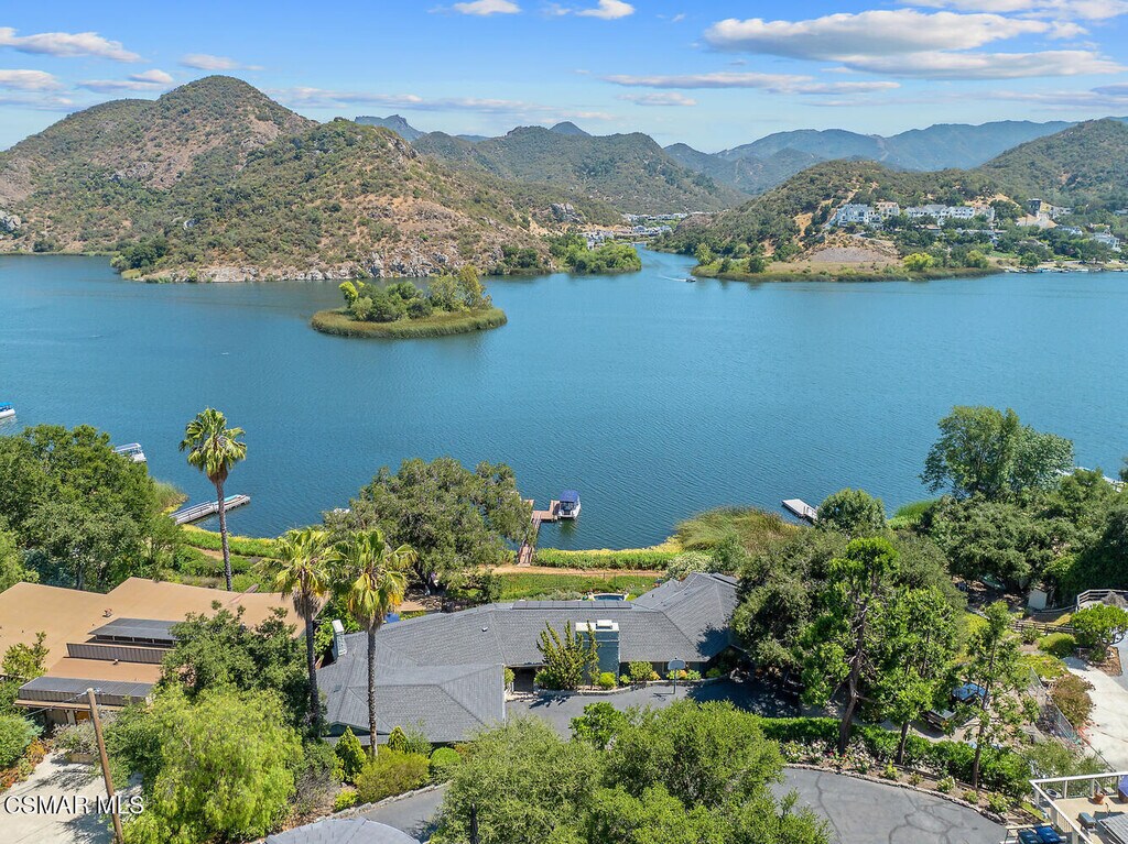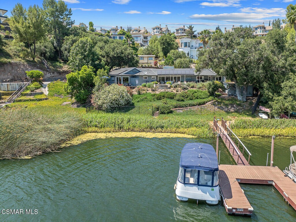 Experience vacation living every single day living at this lakefront home in prestigious Lake Sherwood. A home in this highly sought after location is rarely on the market, and this waterfront locale is arguably THE BEST SPOT on all of Lake Sherwood. Sitting out on the back patio watching the birds and the boats go by is the most relaxing experience and this view is a panoramic lake view right in the middle of the lake. You can see the water shimmering on the lake from almost all the rooms in the home and since the back of the home faces West, the angle of the sun at this home is ideal. At sunset, take a soak in the gorgeous stone infinity spa and life is darn good. This home comes with a private boat dock located right in front. The property features private oak trees and rose and lavender gardens that extend from the patio to the water. With three bedrooms and a spacious office, and two full bathrooms plus a powder bathroom, this ONE STORY home is a wonderful retreat. Bulit in 1954, much of this home has been updated, but it has retained it's vintage charm. The primary bedroom is enormous with a large walk-in closet and floor to ceiling windows to enjoy the lake view at any time of day. The kitchen is a gallery style kitchen with a new induction stove, and the large walk-in pantry will delight all family members. There is also an indoor laundry room with a sink. One perk of this location is access to the private walkway in front of the lake front homes on the north side of the lake which is a magical place to take a morning walk. There is also a converted boat house for extra storage. Please note there is a carport for two cars and ample parking on the driveway but no garage.