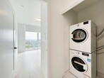 Soak up incredible city views from the 23rd floor in this beautifully designed one-bedroom suite in Toronto's Downtown East/Corktown. The layout is thoughtfully designed, featuring 9-ft smooth ceilings, wide plank flooring, sleek quartz countertops, energy-efficient built-in appliances, a stacked washer/dryer, and a mirrored foyer closet all blending style with convenience. The east-facing windows bring in tons of natural light, making the space feel bright and inviting. Just steps from Underpass Park, local cafés, restaurants, and the Distillery District, you'll also enjoy unbeatable connectivity with a perfect 100 Transit Score and quick access to the DVP, Gardiner, and TTC routes. Beyond the unit, enjoy next-level amenities: a fully equipped gym, yoga studio, study and meeting rooms, a stylish party lounge, kids playroom, outdoor BBQ area, and a rooftop pool with jaw-dropping skyline views. Whether your working, relaxing, or entertaining, this condo delivers the ultimate downtown lifestyle. Included: Integrated Stainless Steel - Fridge, Stove-top, Microwave, Oven, Dishwasher. Stacked Washer & Dryer. 1 Locker Storage Unit.