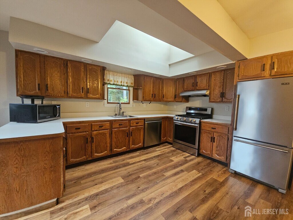 Available of Rent! This well-maintained expanded Cape Cod is bright,spacious and has beautiful layout. It features large living room with natural hardwood flooring and a bay window that fills the space with plenty of natural light. The extended eat-in kitchen features newer (LVP) vinyl flooring,stainless steel appliances including a 5-burner stove,natural wood cabinets,and a raised ceiling with a skylight. The updated main bath offers a tub/shower,linen closet,and (LVP) vinyl flooring. The primary bedroom includes hardwood floors and a large double closet,while the second bedroom on the first floor also features hardwood flooring. Upstairs,there is a common area/flex space and a large third bedroom that could be used as a master suite,along with additional closets and storage space. A finished,carpeted basement adds another level of living space ideal for a recreation room,home office,gym,or more. You'll also find a laundry area and a huge storage closet. Sliders from the kitchen lead to a two-tier deck and a fenced backyard with a paver patio,storage shed. The property backs to a nature preserve for added privacy. Additional highlights include a central AC,central heating,and a location close to schools,transportation,and shopping.