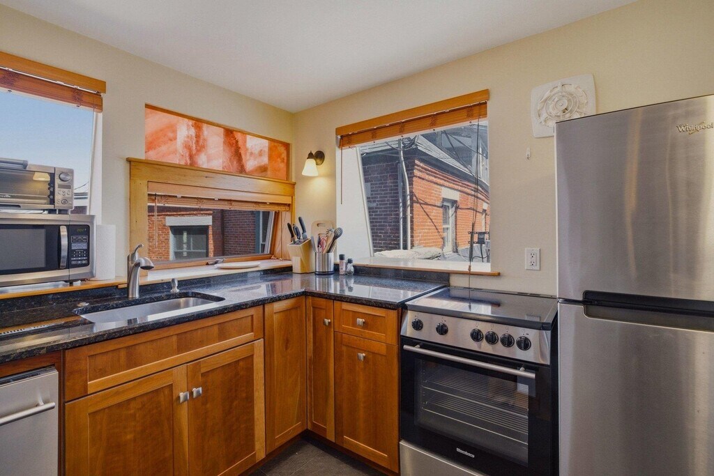 Truly unique Portsmouth living! Nestled among the businesses, bakeries, coffee shops and restaurants of Commercial Alley is this hidden gem". It is vibrant city living at its best. Large light-filled windows with roof-line views reflect life in the heart of downtown. The combination of wood floors, high ceilings, brick walls and beautiful furnishings are a nod to its industrial past. The raised kitchen conversion includes stainless steel appliances, granite counters and views to the alley below. This apartment is fully furnished with everything you need including a queen size bed and mattress set. There is a washer dryer in the hallway laundry room and a secure private entrance with steps giving access directly to Commercial Alley. One garage parking space in the Hanover St Garage is included in the rent. A truly unique living space with character and location! Available June 1. Sorry no pets." MLS# 5084181
