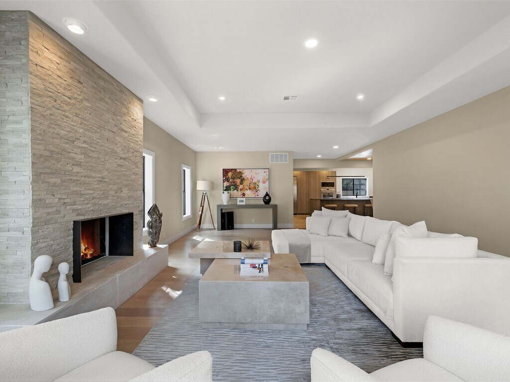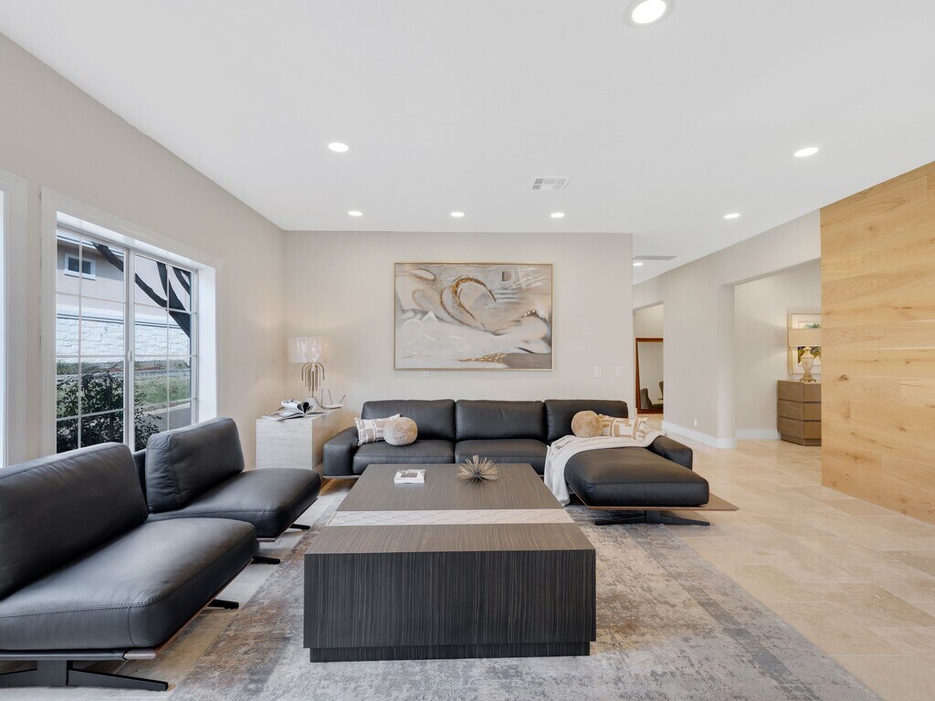 Renovated with a curated material palette, this Mediterranean residence is positioned on a tree lined cul de sac within The Dominion. The exterior presents balanced architectural proportions, while the interior reflects updated finishes and a structured layout. A custom double door entry opens to a two story foyer that establishes separation between formal and informal living areas. The primary living room features a fireplace and ceiling detail, providing a defined gathering space. The kitchen anchors the main level with an expansive island, built in appliances, gas cooking, side by side refrigeration, granite surfaces, and custom cabinetry. It connects directly to a secondary living area with a fireplace and wet bar, creating a functional layout for daily living and entertaining. The main floor includes a private study with built ins and an additional flex room suitable for an office, library, or studio. Upstairs, the primary suite includes dual walk in closets with custom organization and a bath with soaking tub, separate walk in shower, and dual vanities. Two secondary bedrooms complete the upper level, including one with a private bath. Additional features include a four car attached garage and natural gas service. Located within the guarded community of The Dominion, the home offers architectural character and updated interiors within an established setting.