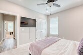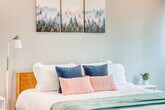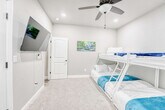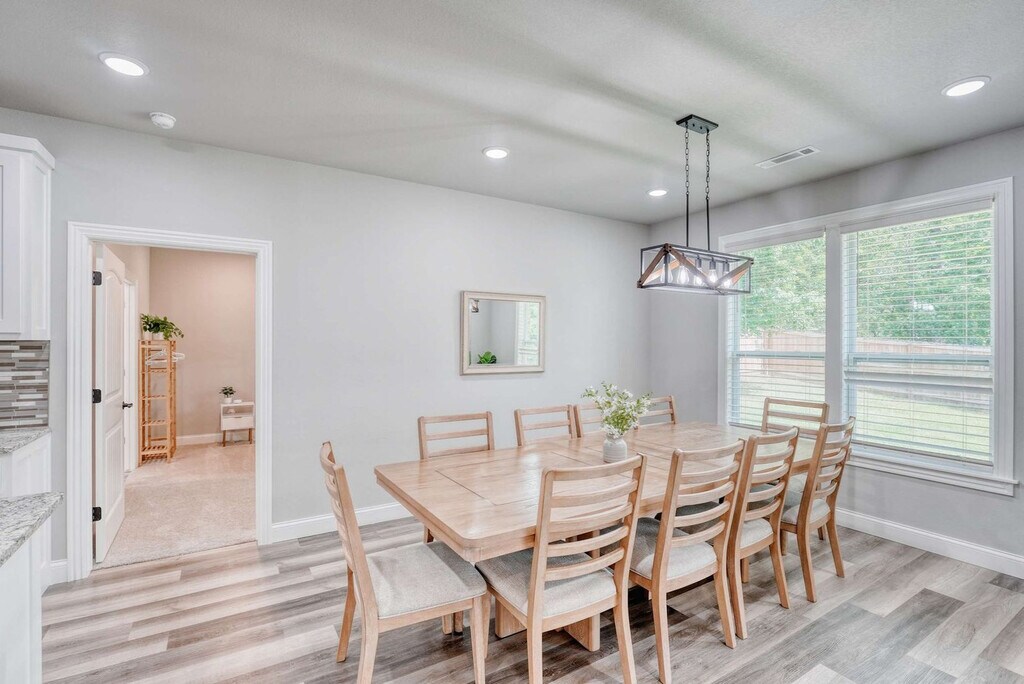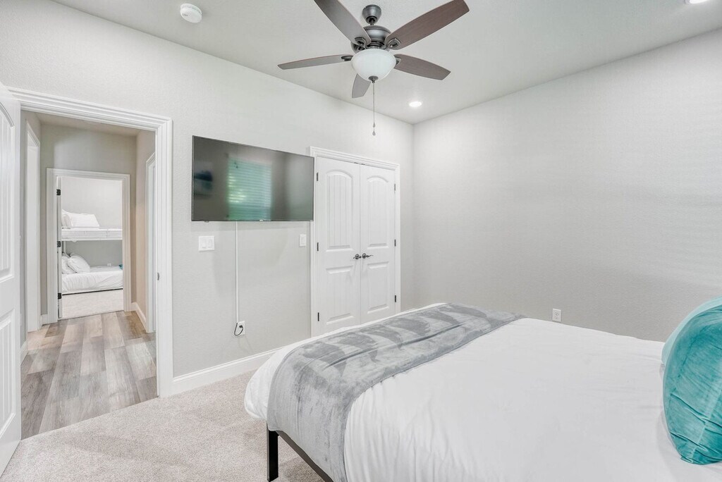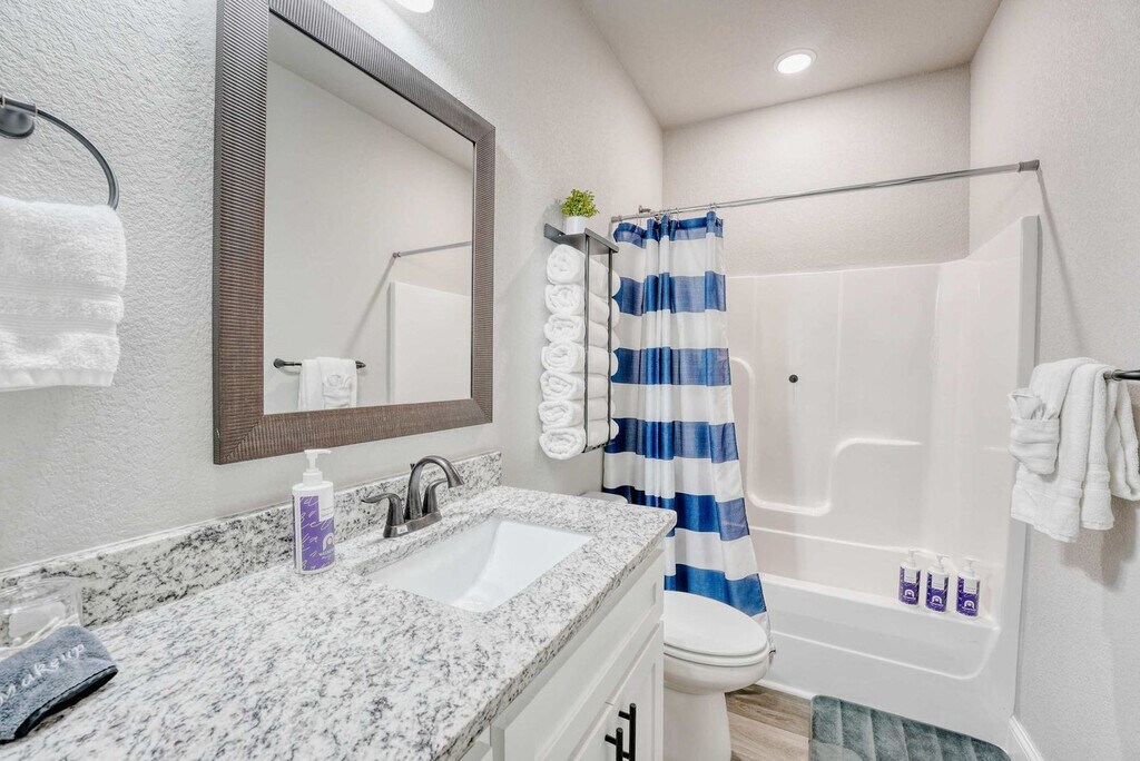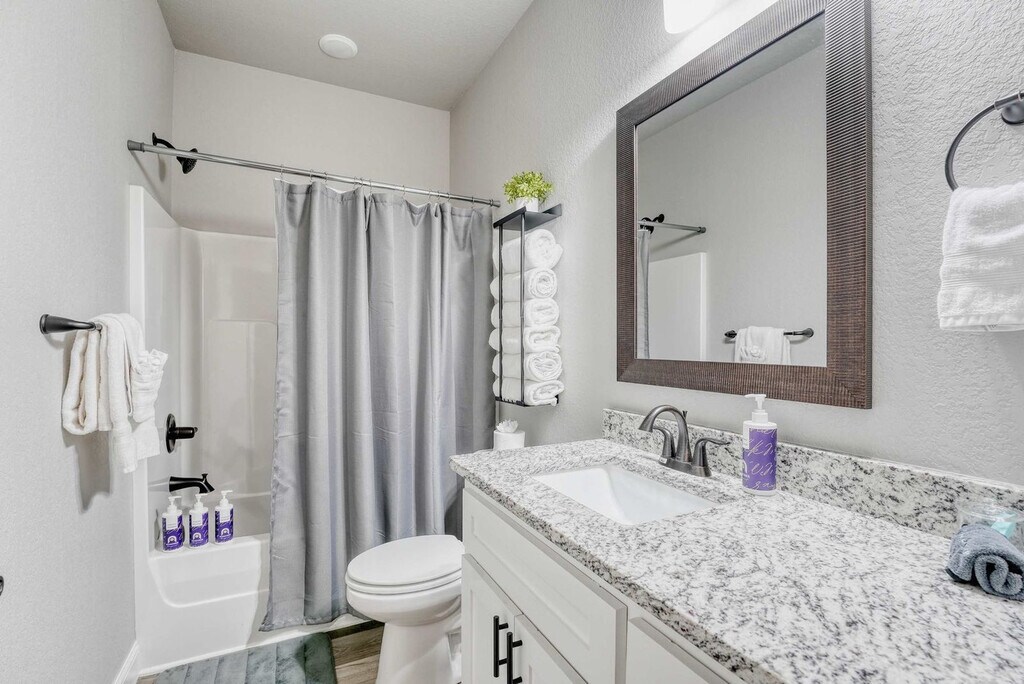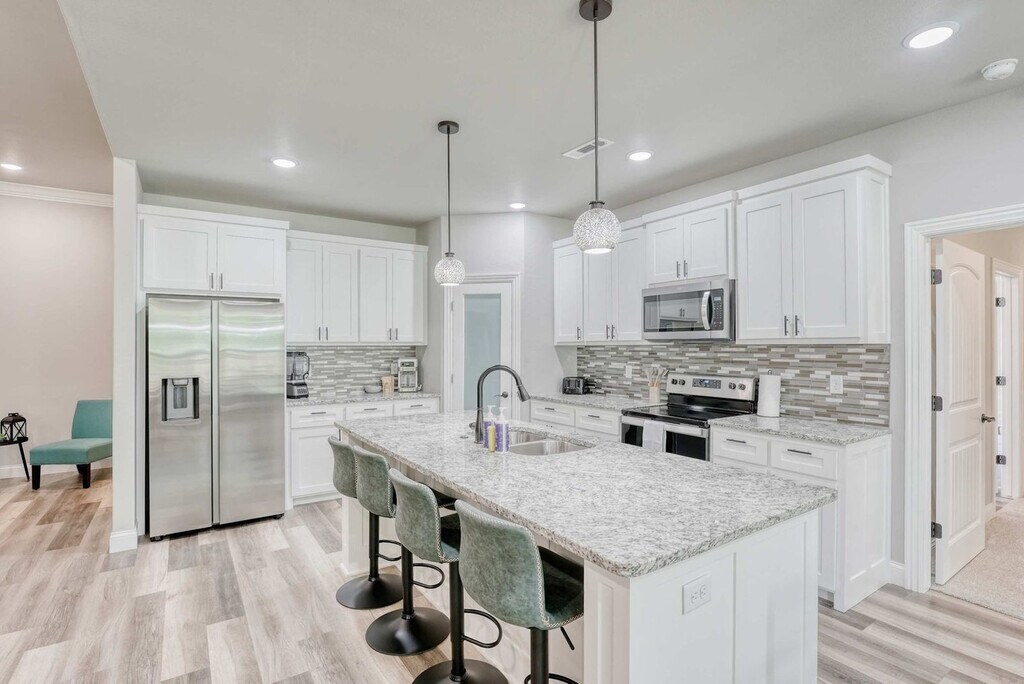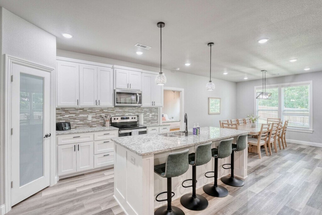 Experience the ultimate adventure getaway in this spacious 5-bedroom, 3-bathroom home, perfectly situated on a quiet cul-de-sac just minutes from the Back 40 and Little Sugar mountain-bike trails. With 2,500 sq ft of living space, this home is ideal for multi-family stays, offering comfort and convenience for all. Nestled on a peaceful street, this home features a king-bed primary suite with an ensuite bath, three guest rooms with queen beds, and a bunk room with two twin-over-full bunks. Enjoy the open-concept kitchen with stainless-steel appliances and granite countertops, flowing into a bright dining area and cozy living room with a stone fireplace. Stay entertained with smart TVs and high-speed Wi-Fi, and take advantage of the dedicated workstation with a standing desk for remote work. Guest passes for community pool access are available upon request. A pet fee applies for up to two pets, and the 3-car garage provides secure storage for bikes, kayaks, or golf clubs. Located in the heart of Bella Vista, this home is just minutes from mountain-bike trailheads, golf courses, and community lakes. Explore the Tanyard Creek Nature Trail or visit the Mildred B. Cooper Memorial Chapel. Dining and shopping in downtown Bentonville are easily accessible, and Northwest Arkansas National Airport (XNA) is about 30 minutes away. Quiet hours are from 9 PM to 8 AM to respect the neighbors. Check-in is after 4 PM and check-out is by 10 AM. Smoking or vaping is not allowed inside or on the property, and no parties or events are permitted. Pets are welcome with a paid pet fee, and guests are asked to clean up after them. The property is professionally cleaned and sanitized between stays, and starter supplies are provided, though guests may need to restock for longer stays. Includes a dedicated workstation with a standing desk, ensuring remote workers can stay productive without missing out on the fun. High-speed Wi-Fi is available throughout the home. [SI]