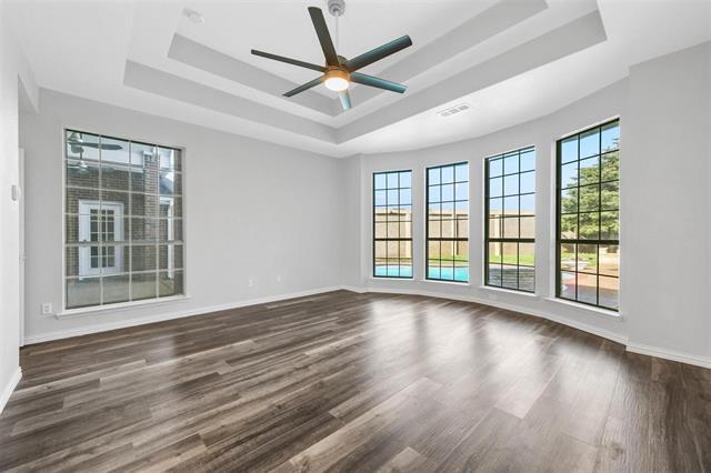 The owner installed a new pool pump. The house is on the end of a cul-de-sac. The home features 3 bedrooms and an office with closet that can be a 4th bedroom with new floors throughout. The house has been newly renovated with brand new appliances such as double ovens, built in microwave, stove top, upgraded with a soaking tub stand shower in master bathroom plus fresh paint top to bottom. The kitchen features quartz countertops, one year new cabinets and gorgeous bay windows. The outdoor features one year new grass, fence, remote controlled pump and filter, driveway, Austin stone flower beds and stone borders, and waterfall. Newer roof.