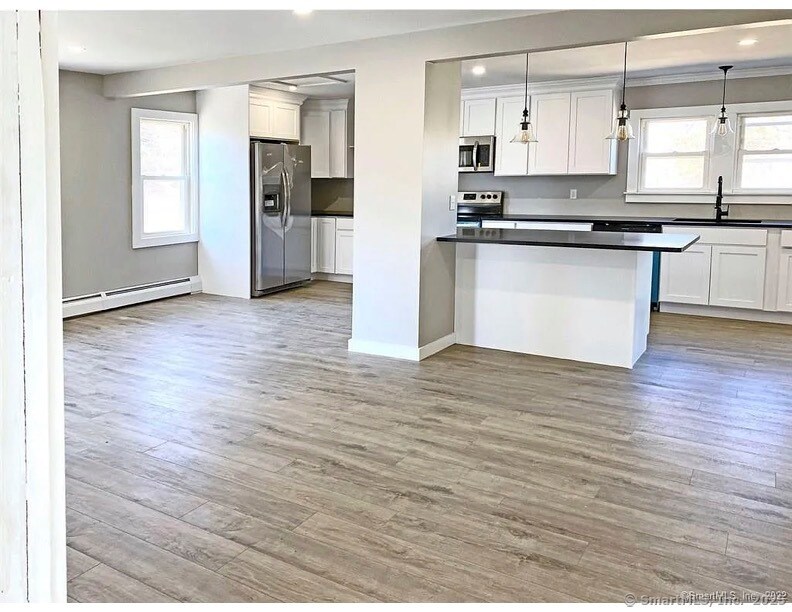 Call for Availability - No work needed here and $30,000 under zillow estimate! Rare opportunity in this stunning, fully renovated Ranch home. With a convenient, private and central location, this 3 BR 2 BA charmer leaves nothing to be desired. Sleek, stylish and wide-open layout, the kitchen will not disappoint with stainless steel appliances, quartz countertops, large island with wine fridge and plenty of space for stools, white shaker cabinets with crown molding, and under counter stainless steel sink with designer faucet. Both of the full baths sparkle! Beautiful tile flooring, custom designed shower with accent tiles and built in toiletry shelf, recessed lighting, and chrome finishes. Entire home is appointed with gleaming hardwood floors, newly painted window and floor trim, recessed lighting, pendant lights over island and sink, solid core recessed 3 panel interior doors. Walls are graced with tasteful, neutral shades of grey. Looking beyond the surface, one will find a newer furnace, and both completely replaced plumbing and electrical systems. Ready for more? Other updates include a laundry room with beautiful tile floors and local carpenter made custom shelving and sliding barn door, interior and exterior light fixtures, switches and plugs, and newer roof and vinyl replacement windows. Step outside...the improvements continue! Newer front and rear wood stairs, exterior door, rear slider and deadbolt locks and low maintenance vinyl siding. Master bath has a beautiful 60 double sink vanity." MLS# 24134723
