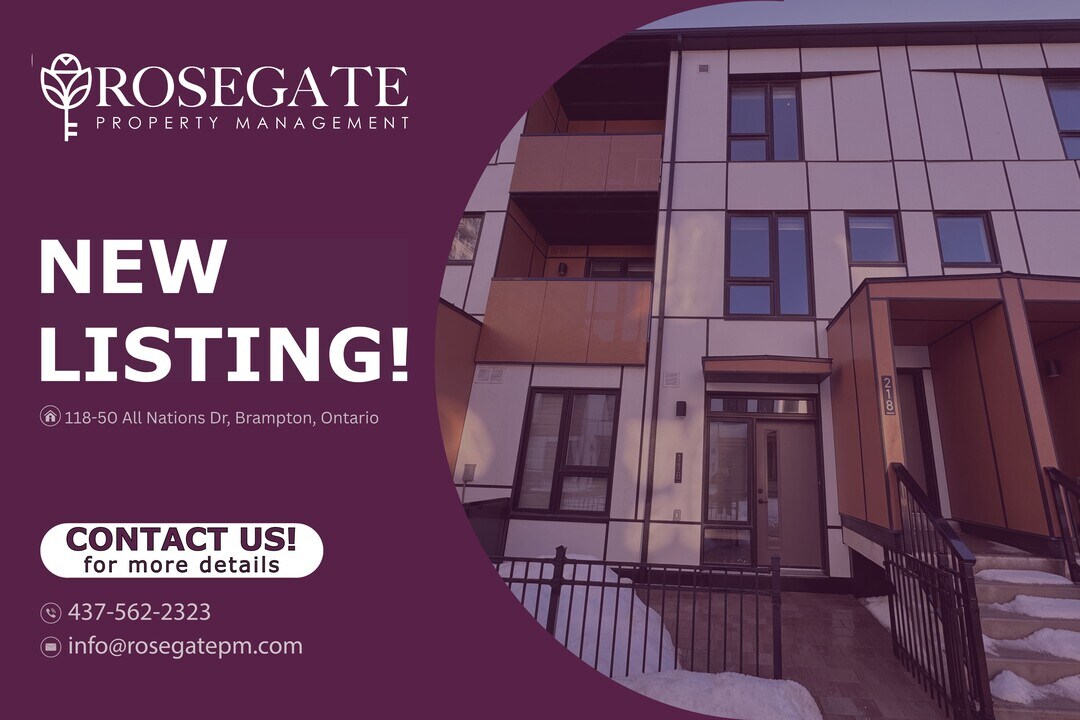 1-Bedroom Freehold Townhouse with Parking & Private Outdoor Space – Brampton Welcome to 118-50 All Nations Dr, Brampton — a well-maintained 1-bedroom, 1-bathroom freehold townhouse offering approximately 600 sq. ft. of efficient and comfortable living space. Perfect for a professional or couple seeking privacy and low-maintenance living in a desirable neighbourhood.The unit features a functional layout with a bright living area and a well-sized bedroom. Enjoy the added benefit of a private outdoor space, ideal for relaxing or enjoying fresh air.One dedicated parking space is included for everyday convenience. Located close to parks, shopping, and major routes, this home offers a practical and comfortable rental option in Brampton.Professionally managed and ready for occupancy. Book your viewing today.
