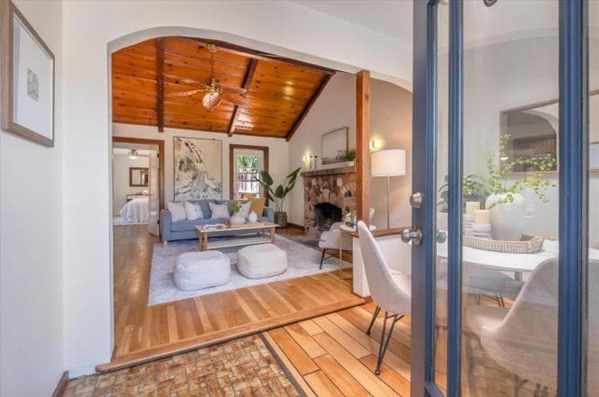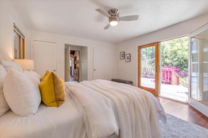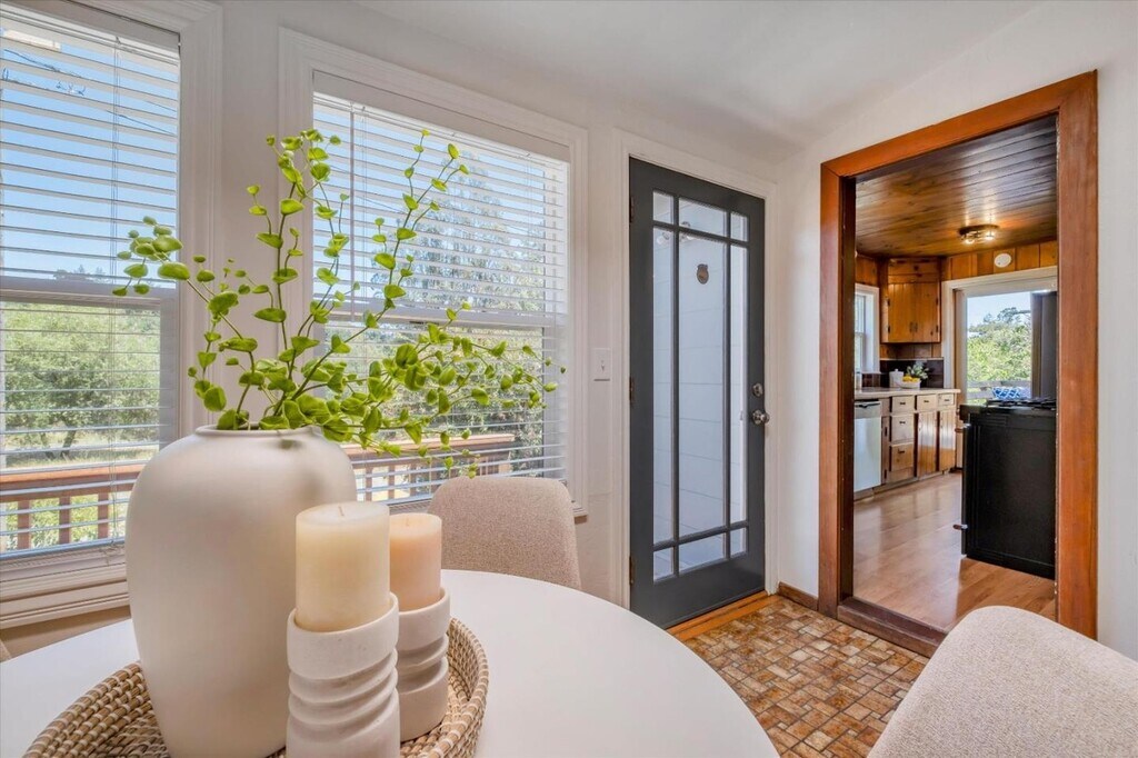 This charming 2-bedroom, 1-bath home offers a perfect blend of nature and convenience, located just 3.5 miles from Santa Cruz Broadway Beach and 3 miles from Scotts Valley. Set back from the road, this home provides exceptional privacy and is ideal as a primary residence or vacation retreat. Enjoy entertaining on the expansive deck surrounding the house, a cozy front porch, and a beautifully landscaped backyard. The separate dining area boasts stunning patio and park views, while the kitchen offers easy access to the deck with built-in benches. The living room features high ceilings, hardwood floors, and a majestic fireplace adorned with real stones.